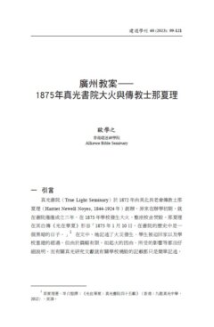 True Light Seminary was founded by American Presbyterian missionary Harriet Newell Noyes (1844-1924) in 1872. At the early stage of school development, just three years after establishing the seminary, the school building was burnt down in 1875 and the schoolhouse was unsalvageable. This article looks back to True Light Seminary Fire, in order to understand how missionaries handled the anti-christian incident and how they recovered in trauma. The first part, which is literature analysis, is to show the history of True Light Seminary and the founder Harriet Noyes and the situation of church development in Guangzhou in the 19th century. Also, it focuses on the social context in that stage, for instant unequal treaties and special rights of missionaries, and how these factors led to rising anti-foreigner sentiment and the outbreak of Guangzhou Anti-Christian Incident—True Light Seminary Fire. The second part of the study analyzes letters from Harriet Noyes and Henry Noyes to reveal the details of the incident and challenges followed by. Besides difficulties faced by missionaries, it also demonstrates how Christian faith supported them to survive and the importance of family and mission boards as a supporting system of missionaries.