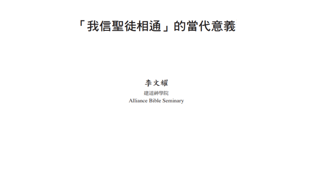 - 李文耀。〈「我信聖徒相通」的當代意義〉。《建道學刊》第42 期 (2014年7月),頁117-143。
