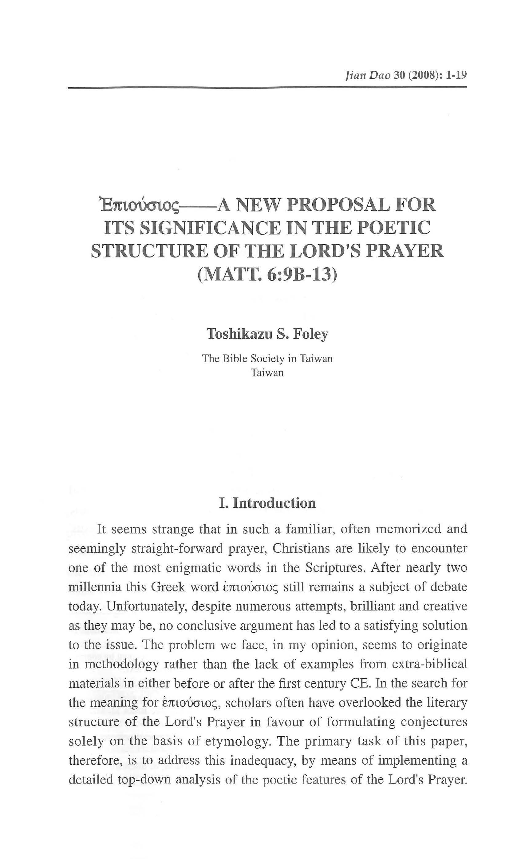 Επιονσιοζ A New Proposal For Its Significance In The Poetic Structure Of The Lord's Prayer (Matt 6:9b-13)['Επιονσιοζ ──就此語對主禱文(太六9下至13)詩體結構的意義提出新獻議]/Toshikazu S. Foley 堀井