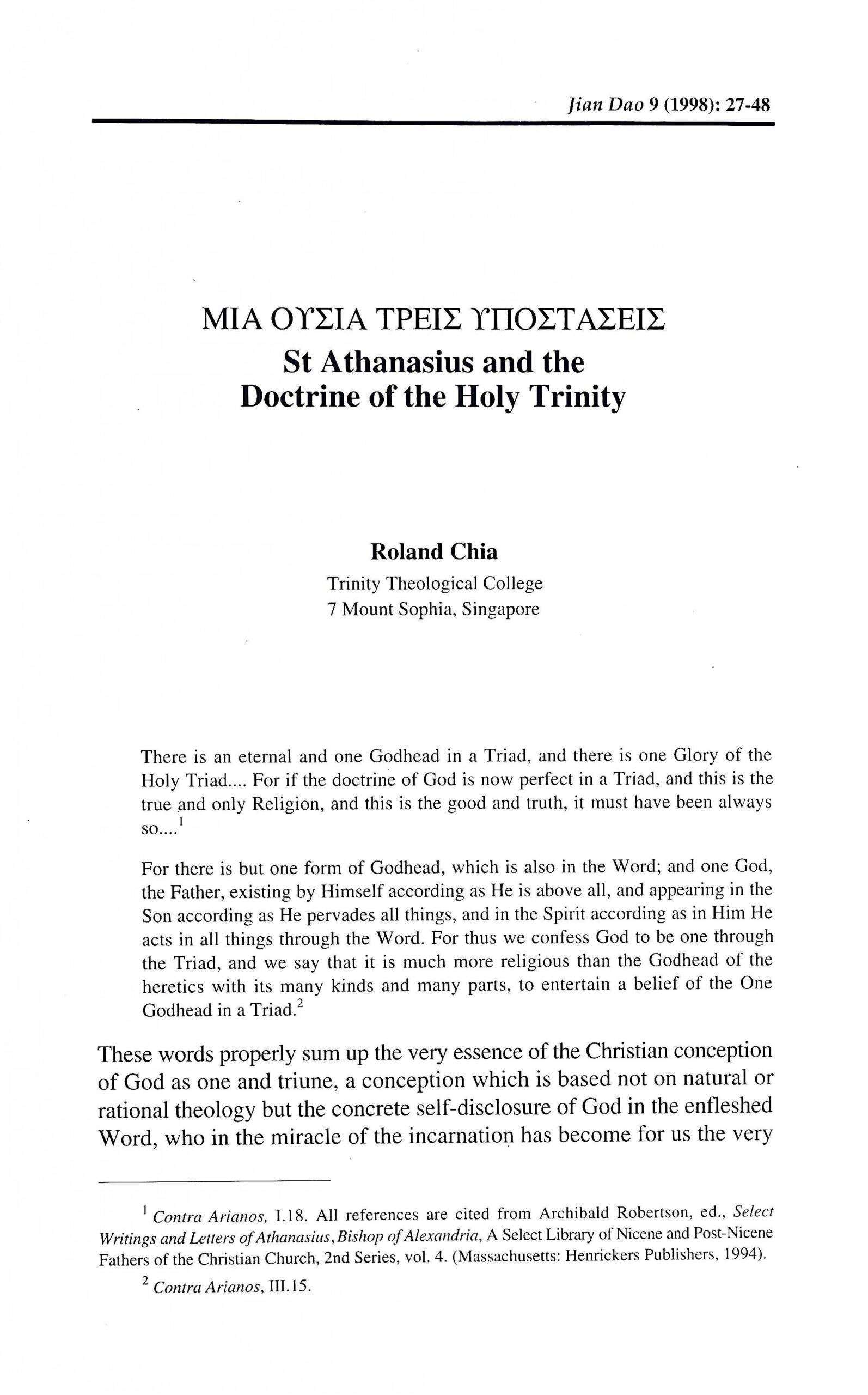 ΜΙΑ ΟYΣΙΑ TPEIΣ YΠΟΣΤΑΣΕΙΣ St. Athanasius And the Doctrine Of The Holy Trinity(三位一體──亞他那修的三一論) / 謝正金