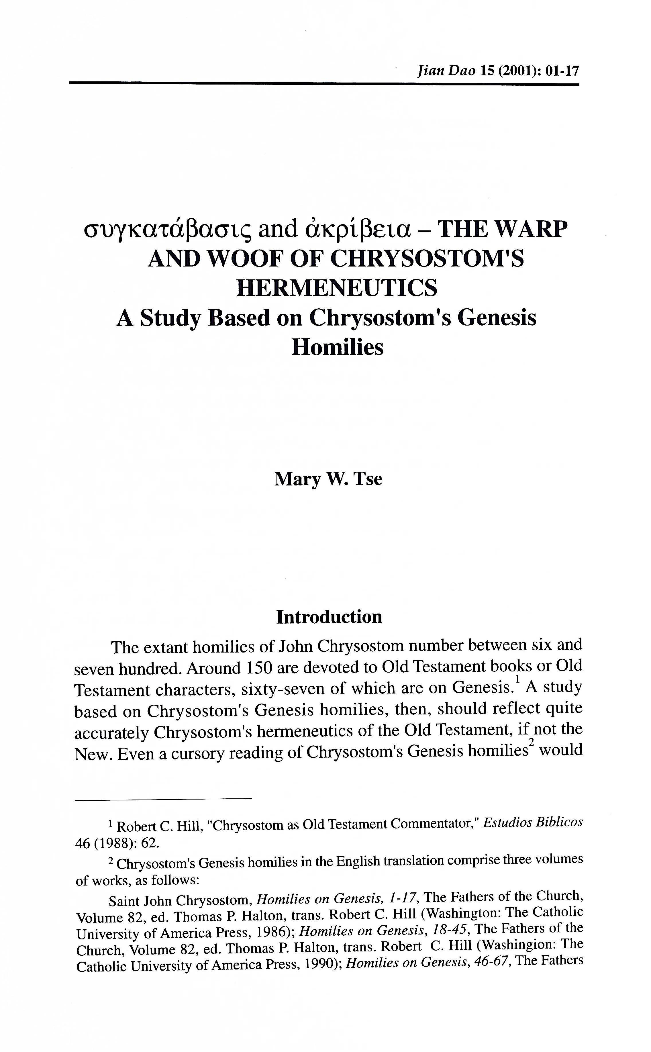 A study done on Chrysostom’s Genesis homilies, then, should reflect quite accurately Chrysostom’s hermeneutics of the Old Testament, if not the New. This paper is a cursory reading on Chrysostom’s Genesis homilies, and attempts to show that the concepts behind the two Greek words, συνκατάβασις (translated as “condescension”) and ἀκρίβεια (translated as “minuteness, detailed significance”) tie in so closely with Chrysostom’s hermeneutics that they actually form the warp and woof of his hermeneutical principles.