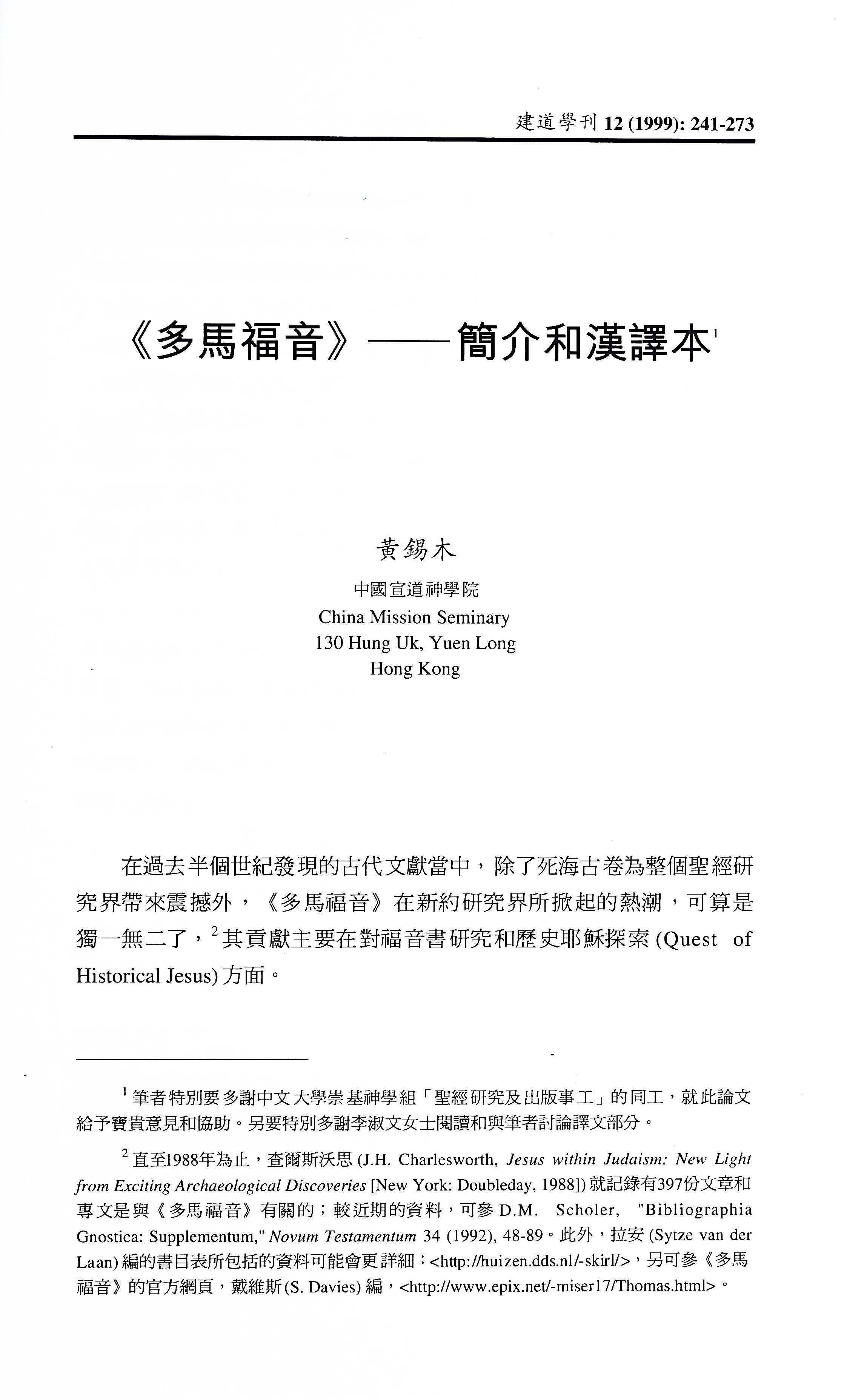 《多馬福音》──簡介和漢譯本 / 黃錫木