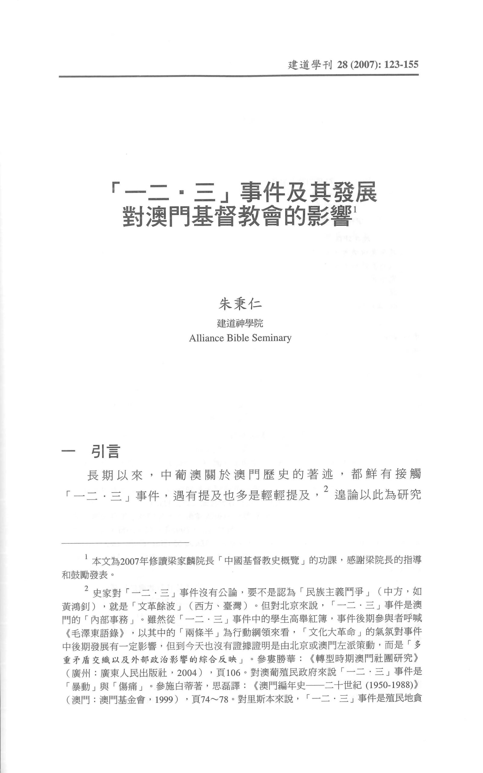 「一二·三」事件及其發展對澳門基督教會的影響/朱秉仁