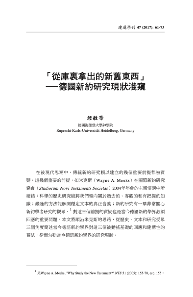 在後現代思潮中,傳統新約研究賴以建立的重要前提都被質疑。本文主要 將從歷史、文本和研究受眾三個角度切入,簡述當今德語新約學界對其動搖的基礎之回應和建構性的嘗試,從而勾勒當今德語新約學界的研究現狀。總的來說,德語新約界的主流依然是堅持歷史研究,但同時不斷改良傳統的歷史批判方法,嘗試將歷史批判的方法與以文本為中心的傳統敘事學理論相結合,同時不斷吸納當代敘事學理論的新成果。對於受眾危機的回應,以戴歌德為代表的德語學者努力將學術與時代問題結合,希望新約研究能服務教會和更廣闊的社會羣體。