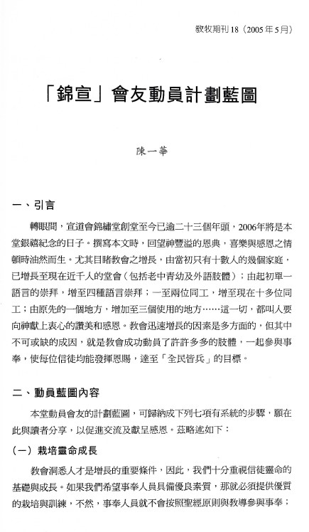 宣道會錦繡堂創堂至作者撰文時已逾二十三個年頭,由當初只有十數人的幾個家庭,已增長至現在近千人的堂會。教會迅速增長的因素是多方面的,但其中不可或缺的成因,就是教會成功動員了許許多多的肢體,一起參與事奉,使每位信徒均能發揮恩賜,達至「全民皆兵」的目標。