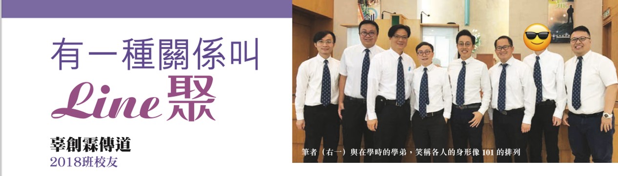 「已婚型男Line」顧名思義就是一班已婚男同學的學兄弟。與一般居住在男/女生宿舍的做法不同,新入學的同學會與自己的學兄/姊住在同一房間,無論是學習需要或是長洲生活,都有學兄/姊加以指導。而我們Line除了上述指導,還包括與伴侶相處、子女教養學習,甚至是事奉與家庭的平衡,學兄們也會給予建議。我在校時的學兄弟人數比較多,因為收多於一位學弟,加上也住在長洲,所以彼此的關係很緊密,亦會互相幫忙。其中我們印象最深刻的,就是暑假尾段,有時學兄弟未必在島(長洲)上,留在長洲的會幫忙於實習部的約談板上寫下預約時間;又或是我們會一齊做功課,一齊在「文化中心」做學院工作,或是一齊在學院時經歷生命的蛻變,這些都是美好的回憶。