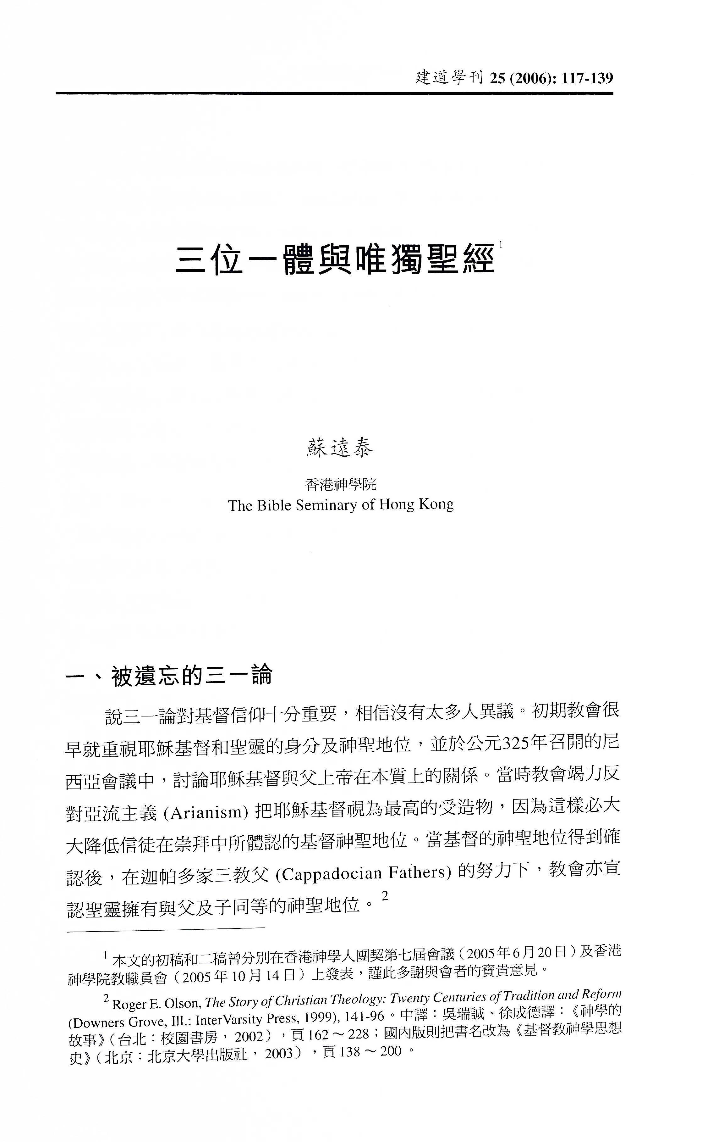 本文嘗試探討華人教會一個奇怪的現象,就是把三位一體的教義邊緣化。華人教會普遍側重實效而忽略哲學和神學的討論,包括三一論和基督論。原因固然是多方面的,而筆者發現華人教會大多抱持激進改革派的「唯獨聖經」觀念,強調聖經的最高權威,卻否定傳統和信經的價值,這也是構成這現象的原因之一。華人教會把「唯獨聖經」變成「惟讀聖經」,其實是對權威改教者的誤會。由於聖經內並沒有「與父同質」、「位格」、「三位一體」等詞彙,歷史上對三位一體的討論,尤其是所謂的「內在三一」,便被視為非源於聖經,亦非有堅實的聖經基礎而遭到否定。因此,三一教義便變成「被遺忘的三一」了。筆者要指出,教父神學接受三位一體及基督兩性論,因此,改教者也視這些神學觀念來自聖經;而加爾文更直接指出激進改革派的錯誤,因教父神學是基於真正的「唯獨聖經」而產生的。由此可知,傳統就是聖經的權威詮釋。