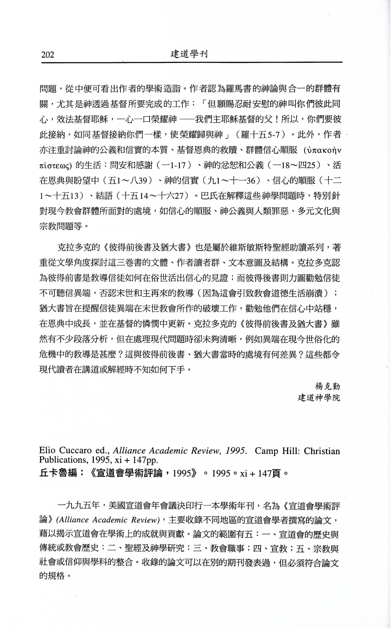 丘卡魯。《宣道會學術評論,1995》(Cuccaro, Elio, Ed. Alliance Academic Review, 1995.) / 梁家麟