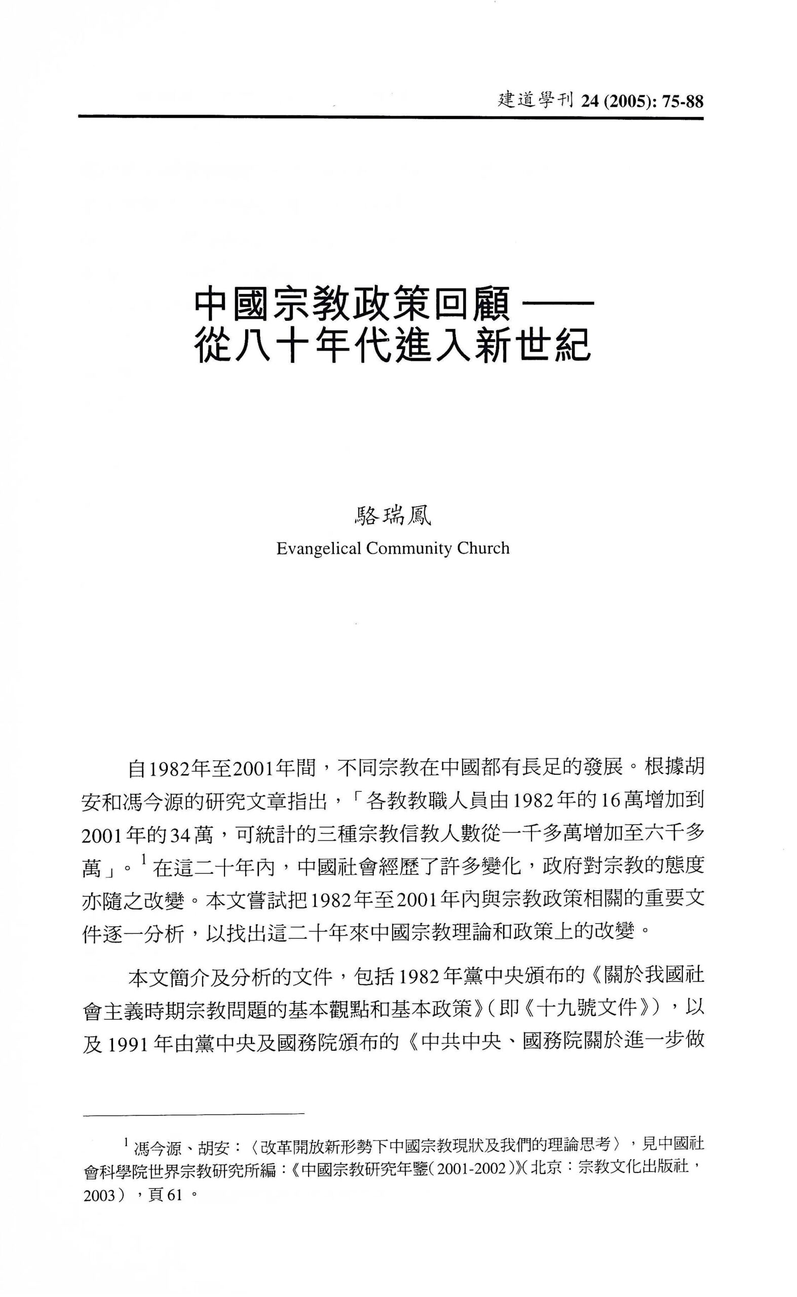 中國宗教政策回顧──從八十年代進入新世紀/駱瑞鳳