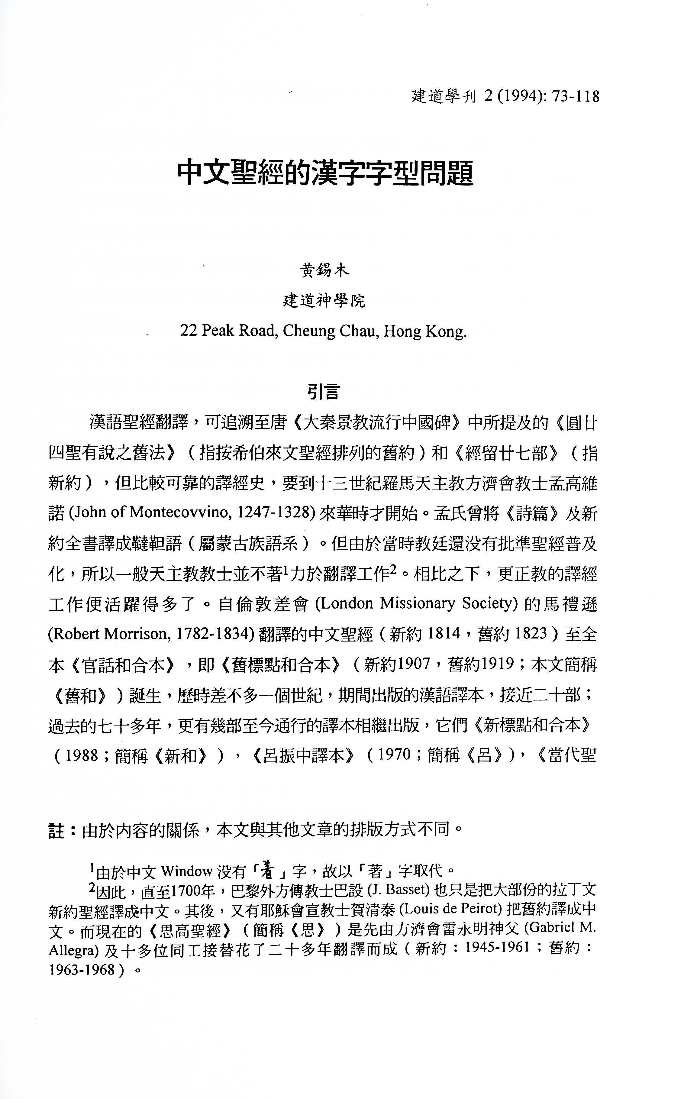 This article is an report on the project to replace all the “special characters” (a total of 118) found in the current electronic text of the three Chinese versions (CUNP, TCV, and LUV) by “standard characters” with the condition that the message of the text will not be affected. For a number of years since the first appearance of the Chinese computer Bible produced by Rev. T.C. Chow, these “special characters” have become a major obstacle both for the computerization of the Chinese biblical texts, and the production, i.e. computer typesetting. The undertaking of this project is approved by the Chinese Consultation (United Bible Societies) and is funded by Hong Kong Bible Society.