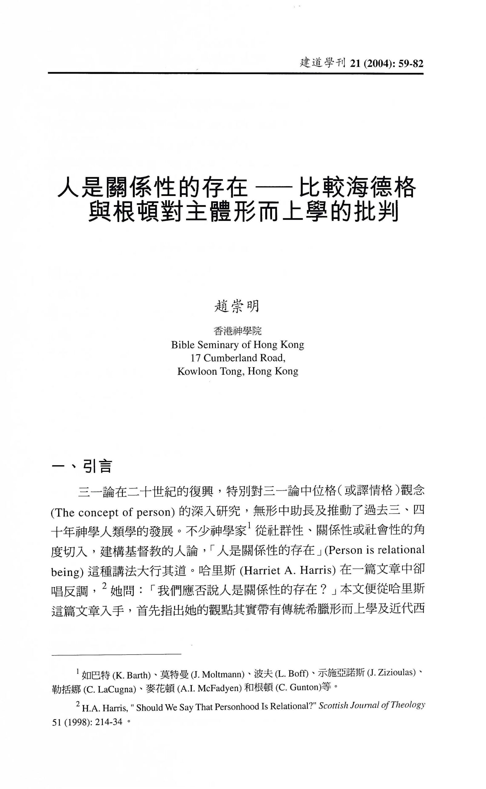 當代神學人類學的發展跟三一論在二十世紀的復興有關,因為不少神學家從三一論(特別是社群三一論)中位格的觀念得到靈感,從而開拓了一個從社群性或關係性的角度,由此切入去建構基督教的人論,「人是關係性的存在」這種講法愈來愈受到重視。但哈里斯(Harriet A. Harris)在一篇文章中卻質疑上述這種講法,本文便從她這篇文章入手,首先指出她的觀點其實帶有傳統形而上學及近代西方主體形而上學的影子。跟著筆者便直接討論主體形而上學中的自我同一性及自我觀的問題。針對這些問題,在文章的下半部分,便從三方面(關係性、時間性、自由)比較海德格(Martin Heidegger)及根頓(Colin E. Gunton)的人觀對主體形而上學的批判,從而探究「人是關係性的存在」這句說話可以作何種詮釋,亦由此對這種講法給予正面的肯定。