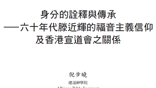 - 倪步曉。〈身分的詮釋與傳承—六十年代滕近輝的福音主義信仰及香港宣道會之關係〉《建道學刊》。第六十一期。2024年1月。頁157-193。