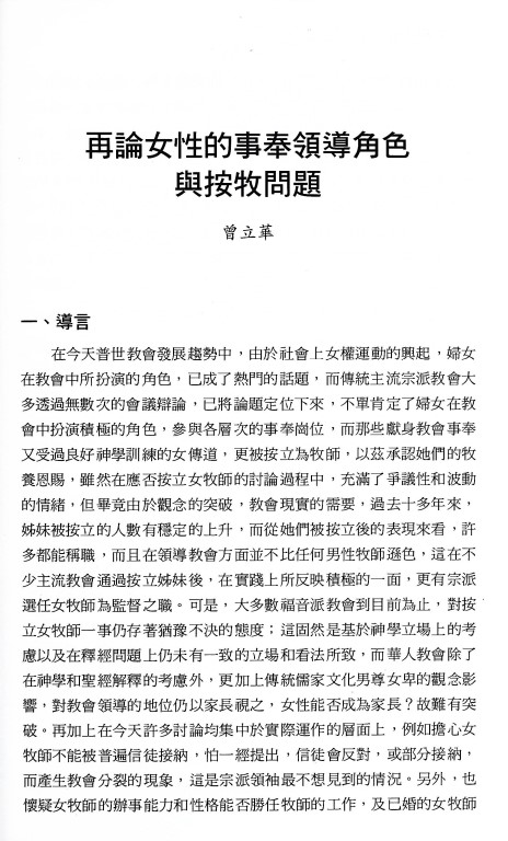 傳統主流宗派教會大多透過無數次的會議辯論,肯定了婦女在教會中扮演積極的角色。可是,大多數福音派教會到目前為止,對按立女牧師一事仍存著猶豫不決的態度。作者對女性事奉領導分為四個觀點:傳統、修正、輔助性和開放的看法。不少福音派釋經家都較傾向後兩個觀點,乃因他們經過詳細研究討論後,認為保羅的看法是按當時環境作暫時性的量度,而不是一個恆久凝固不變的原則。其實整個問題在乎我們怎樣看待女性在神眼中的位置,以及教會事奉職事的性質,與耶穌對領導本質的看法,作者就從這個角度來探討。本文討論女性與神的本質、女性與創造、並女性與教會。關乎教會職事觀,神是容許歷代教會在職事安排及做法上可以頗有彈性。