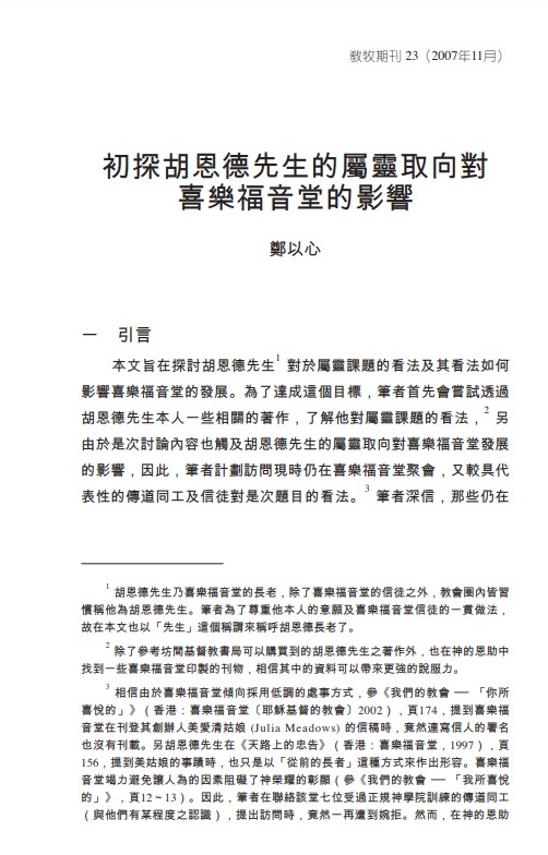 初探胡恩德先生的屬靈取向對喜樂福音堂的影響/鄭以心