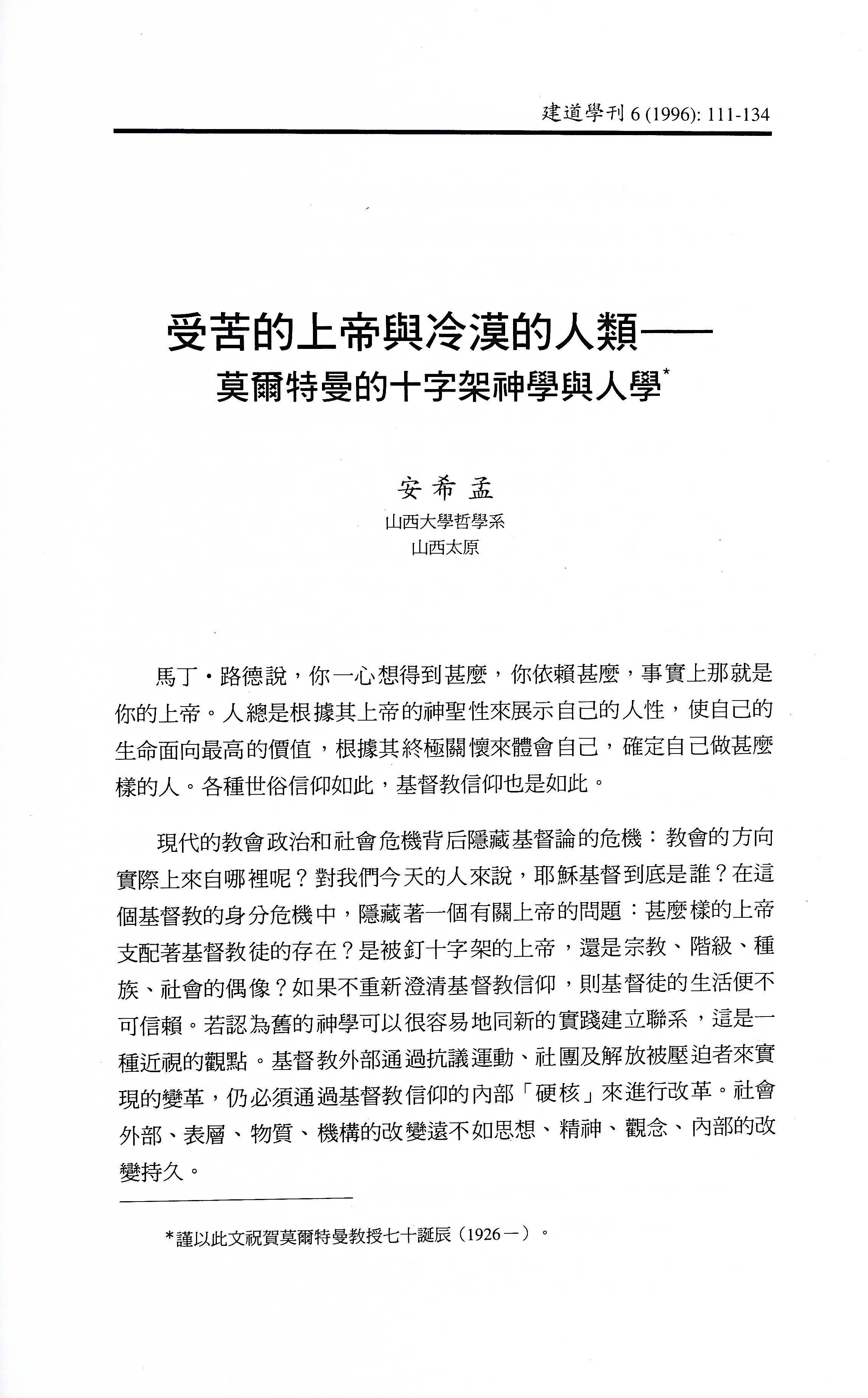 受苦的上帝與冷漠的人類──莫爾特曼的十字架神學與人學 / 安希孟