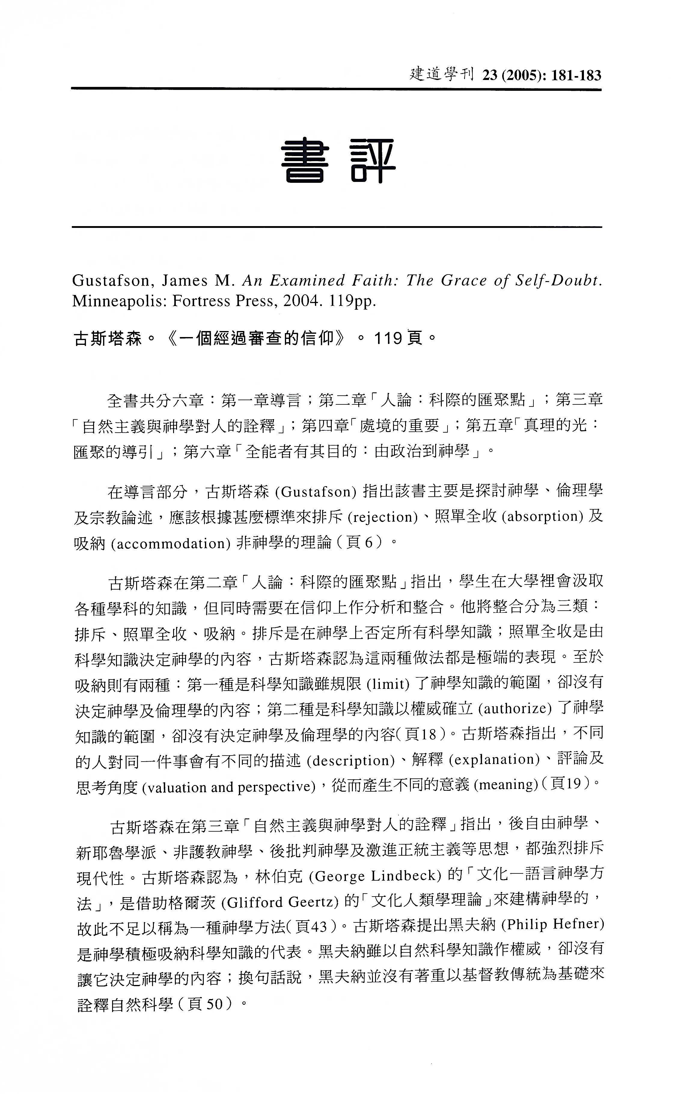 古斯塔森。《一個經過審查的信仰》。(Gustafson, James M. An Examined Faith: The Grace of Self-Doubt.)/郭鴻標