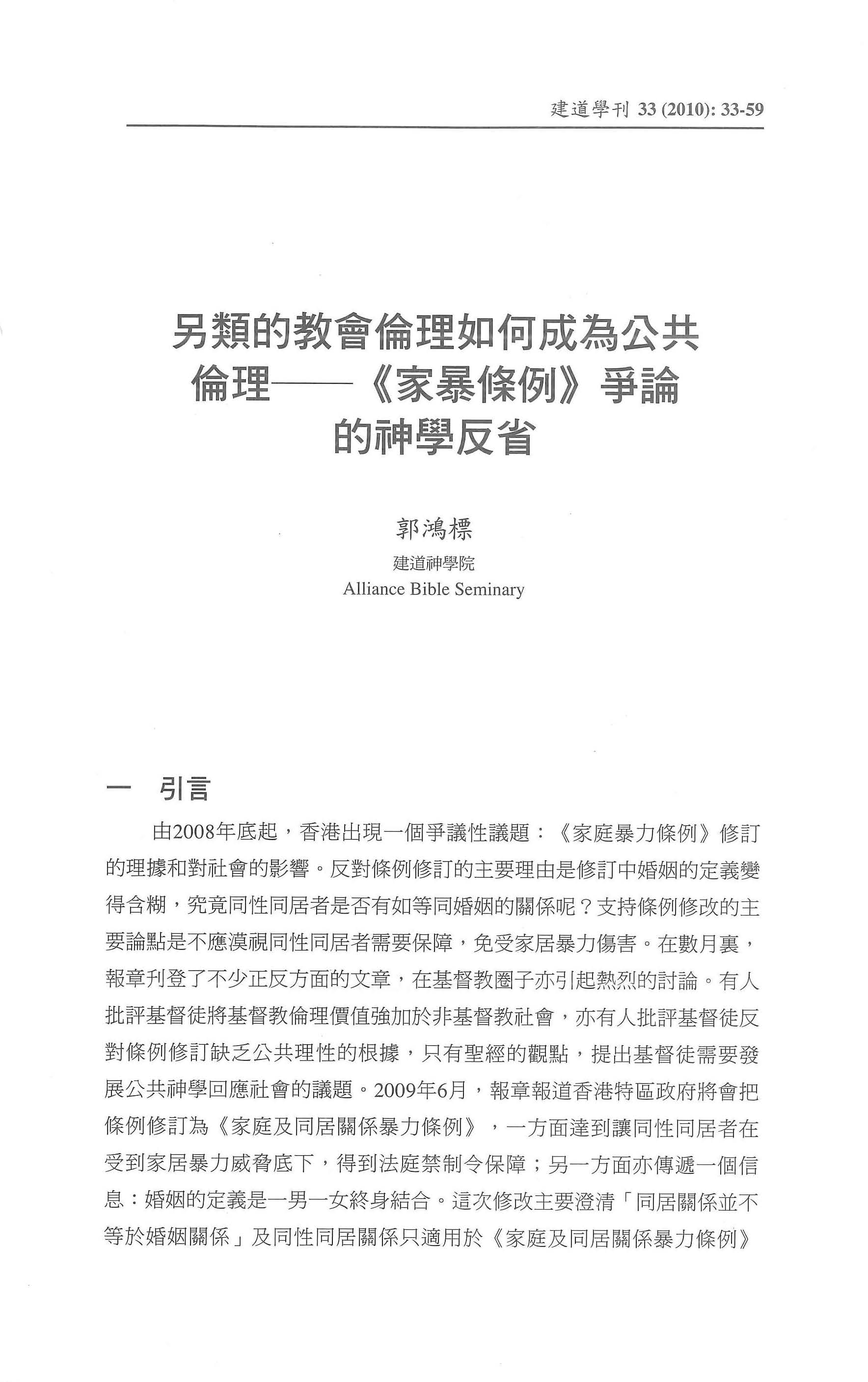 另類的教會倫理如何成為公共倫理──《家暴條例》爭論的神學反省/郭鴻標