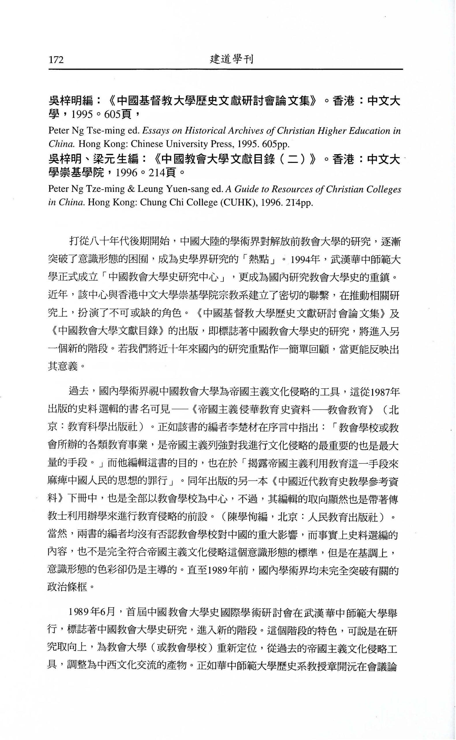 吳梓明編。《中國基督教大學歷史文獻研討會論文集》。 吳梓明、梁元生編。《中國教會大學文獻目錄(二)》。 / 邢福增