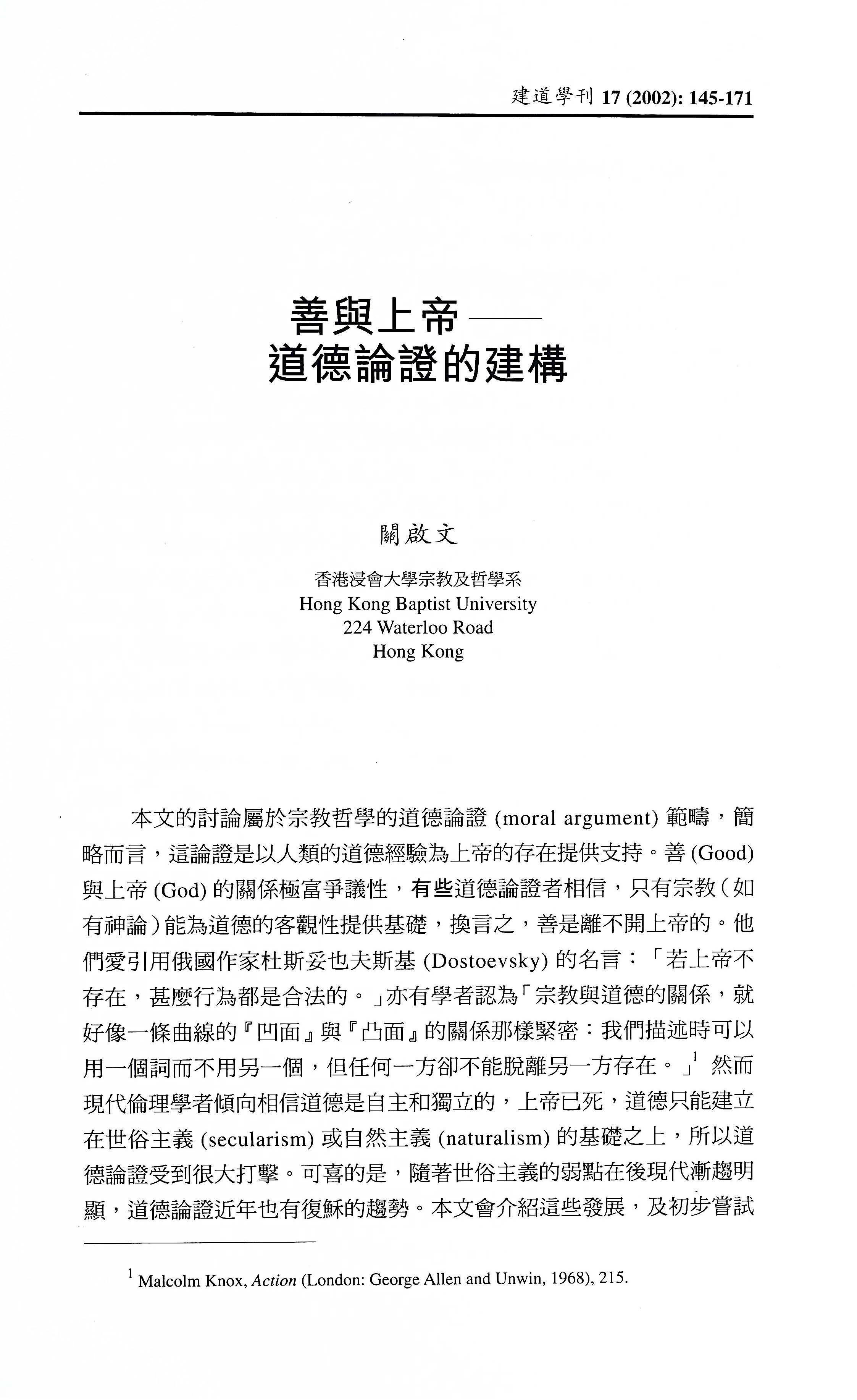 道德論證認為我們的道德經驗能為上帝的存在提供支持,近年道德論證有復興的趨勢。本文會介紹這些發展,及建構一種作為「最佳說明推論」的道德論證:神本倫理(特別對比起自然主義)最能解釋道德的客觀性。(筆者在前一篇文章已論證,自然主義不大能解釋道德的客觀性。)筆者特別就三方面展現神本倫理的合理性:一、要充分解釋道德律的存在,我們需要一位神聖立法者;二、絕對責任的真實性難以在絕對的上帝以外找到基礎;三、神律倫理能為善的追尋、人性的實現與人生的意義提供最令人滿意的解釋與支持。筆者的結論是:道德論證雖然不是決定性的證明,但它可成為支持上帝存在的累積論證的重要部分。