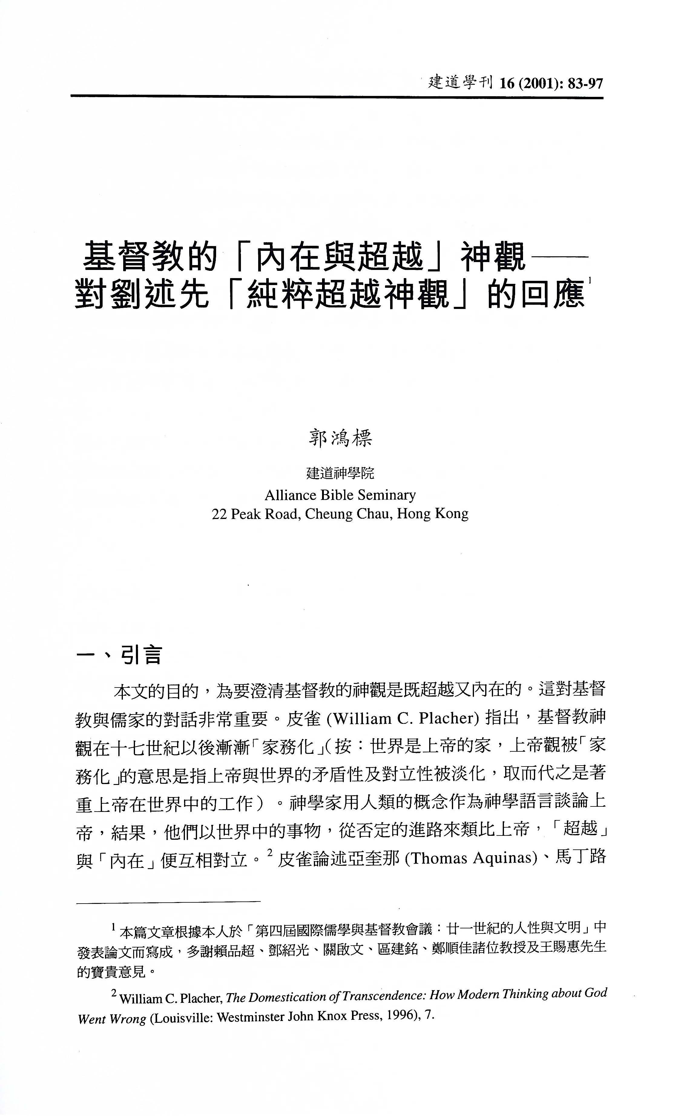 基督教的「內在與超越」神觀──對劉述先「純粹超越神觀」的回應/郭鴻標