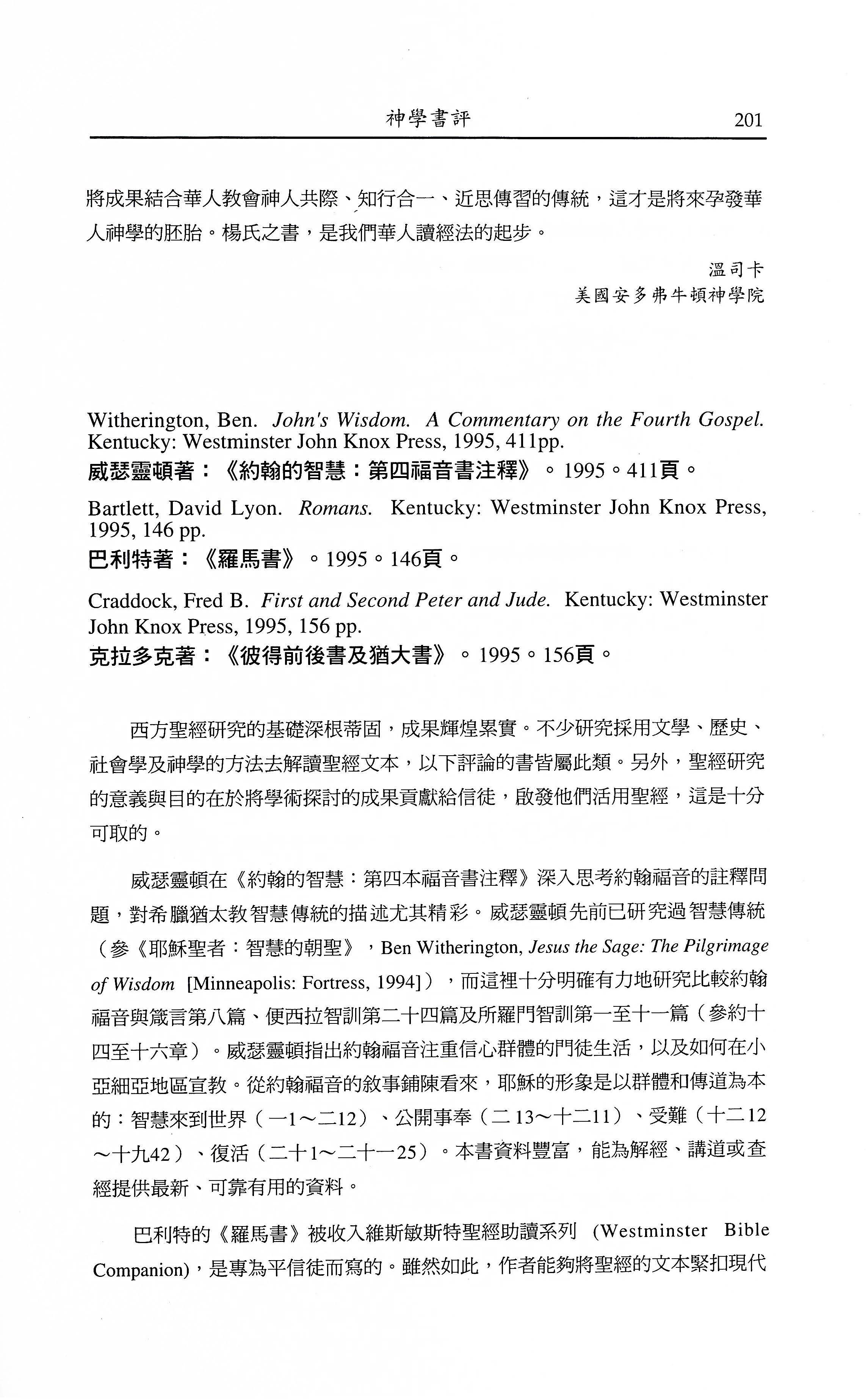 威瑟靈頓。《約翰的智慧:第四福音書注釋》。(Witherington, Ben. John’S Wisdom. A Commentary On The Fourth Gospel.) / 楊克勤