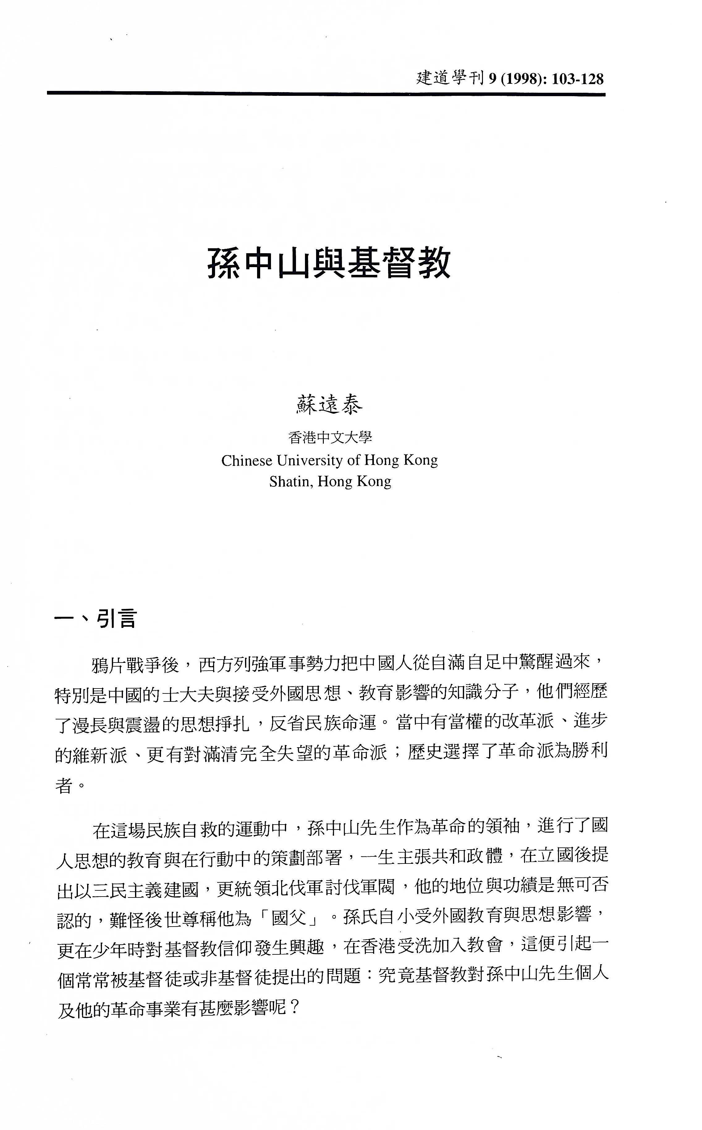 Dr. Sun yat-sen was baptised and became a Christian in his early years. In addition, he claimed himself to be a Christian at the time of his death. However, he did not share a Church life like most of the Christians do. Dr. Sun did rarely mention his Christian belief as well. In such a case, the interpretation of his relationship with Christianity varies due to parties of different interests. Christians thought that he was a pious believer. Moreover, his revolutionary ideal was even considered to be originated in Christianity. Contradictorily, Kuomintang (KMT) denied his identity as a Christian with vigor. In 1928,there was a dispute over the abolition of the slogan “no more religion” in the KMT party. Through the investigation of the dispute as well as what Dr. Sun did and said, this paper is meant to find out the relationship between Dr. Sun and Christianity.