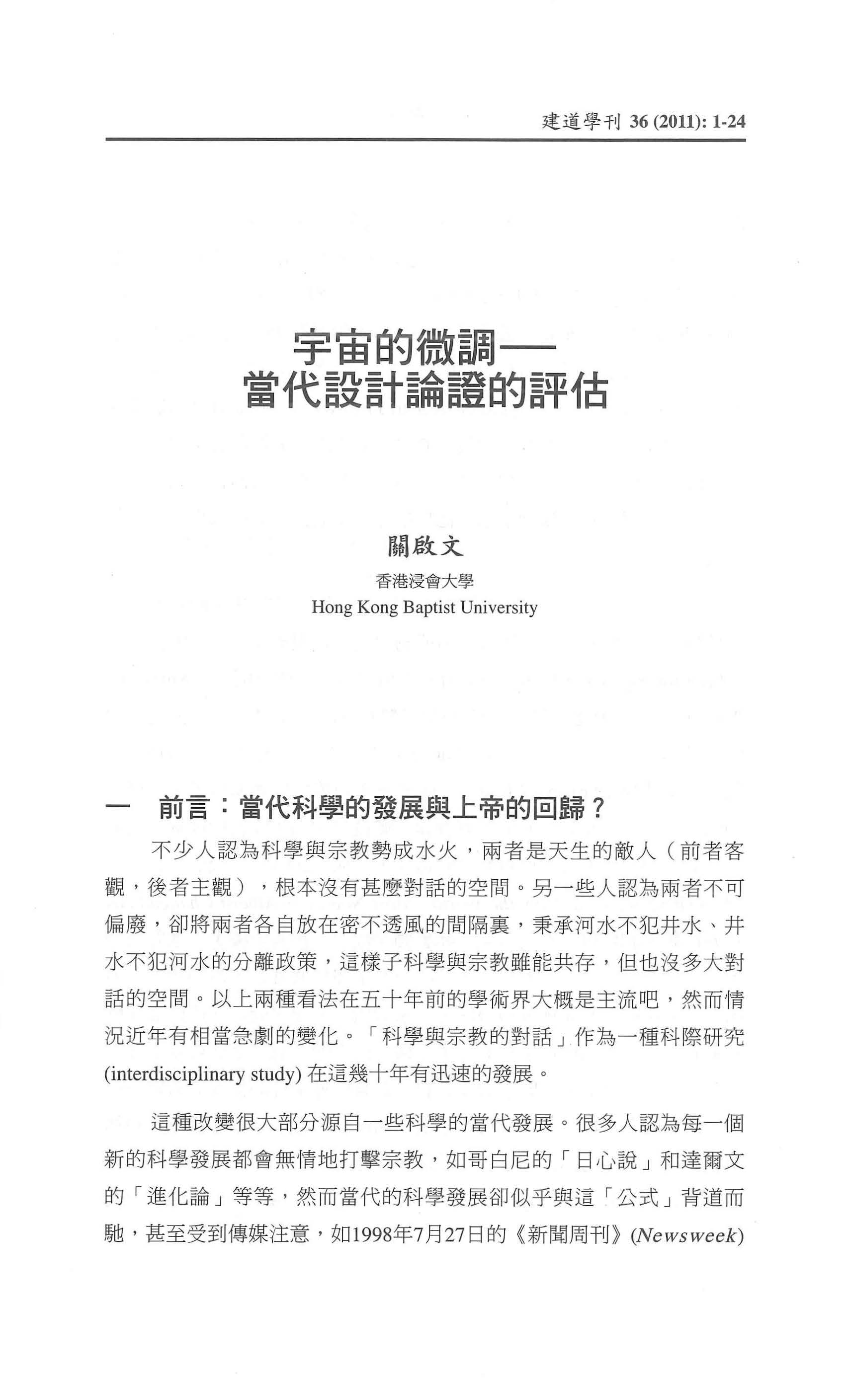 不少人認為每一個新科學發展都會對宗教作出打擊,但近代宇宙學的重大發現「宇宙的微調」(Fine-tuning of the Universe)卻似乎指向宇宙設計師的可能性,因為整個宇宙的爆炸和基本設計好像都是經過精微的調校,以致生命能夠出現,只要有最輕微的改動,生命的出現都變成不可能。本文首先介紹宇宙微調的種種現象,如大爆炸的速率,基本定律的常數值,碳等元素的核共振水平(nuclear resonance level)等;然後指出有神論對宇宙微調的解釋有初步合理性,當然也受到各種批評;最後我會就着十種主要批評作出回應。我承認這課題還有很多複雜問題要處理(如多重宇宙),但當代科學發展的確使設計論證以宇宙微調論的形式復甦,而這論證是不可忽略的。