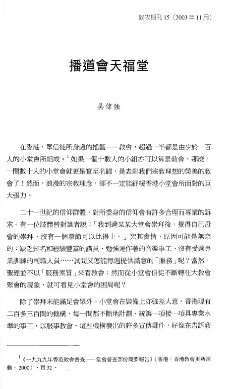 有一位肢體曾對作者說:「我到過某某大堂會崇拜後,覺得自己母會的崇拜,沒有一個環節可以比得上。」究其實情,原因可能是無奈的。作者分析了小堂會自身實存的困難,崇拜、裝備事工、佈道栽培事工、傳道牧者的帶領挑戰等。從關係性的敎會代模分析,小堂會最重要的,是能彼此相愛,而不是解決其他技術性的問题,所以小堂會的代模,亦必然是關係性的。從「維修式的教會管理」角度,分享自己的牧養方略的三個重點:1. 解決問題(不要製造問題);2. 融合意見一以不破壞關係為大前提;和3. 用自己最現成的方法接觸人。作者蒙母堂差派往一所新堂會開荒事奉,本文是作者分享這十年的經驗。