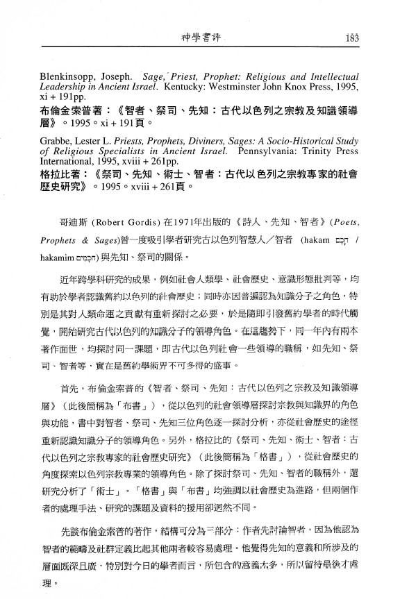 布倫金索普。《智者、祭師、先知:古代以色列之宗教名知識領導層》。(Blenkinsopp, Joseph. Sage, Priest, Prophet: Religious And Intellectual Leadership In Ancient Israel.)格拉比。《智者、祭師、先知:古代以色列之宗教專業之社會歷史研究》。(Grabbe, Lester L. Prophets, Diviners, Sages: A Socio-Historical Study Of Religious Specialists In Ancient Israel.) / 謝品然