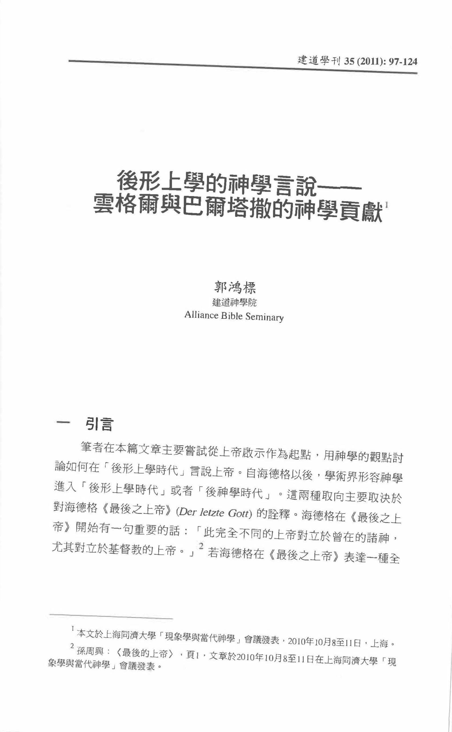 後形上學的神學言說──雲格爾與巴爾塔撒的神學貢獻/郭鴻標