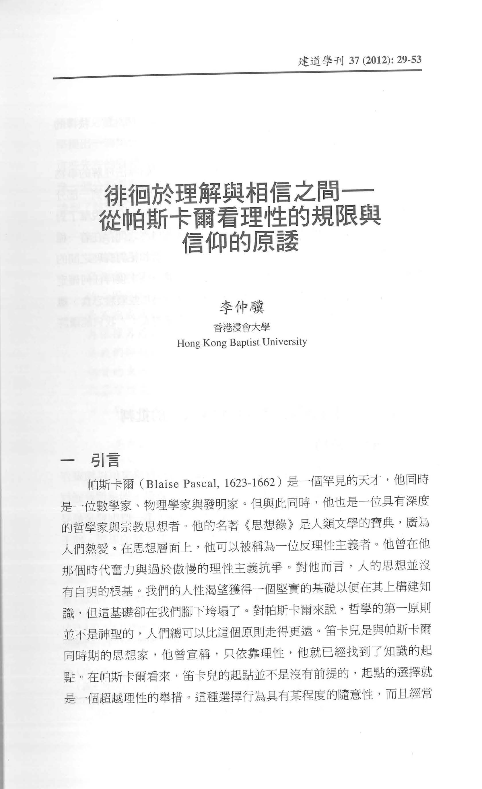 徘徊於理解與相信之間──從帕斯卡爾看理性的規限與信仰的原諉/李仲驥