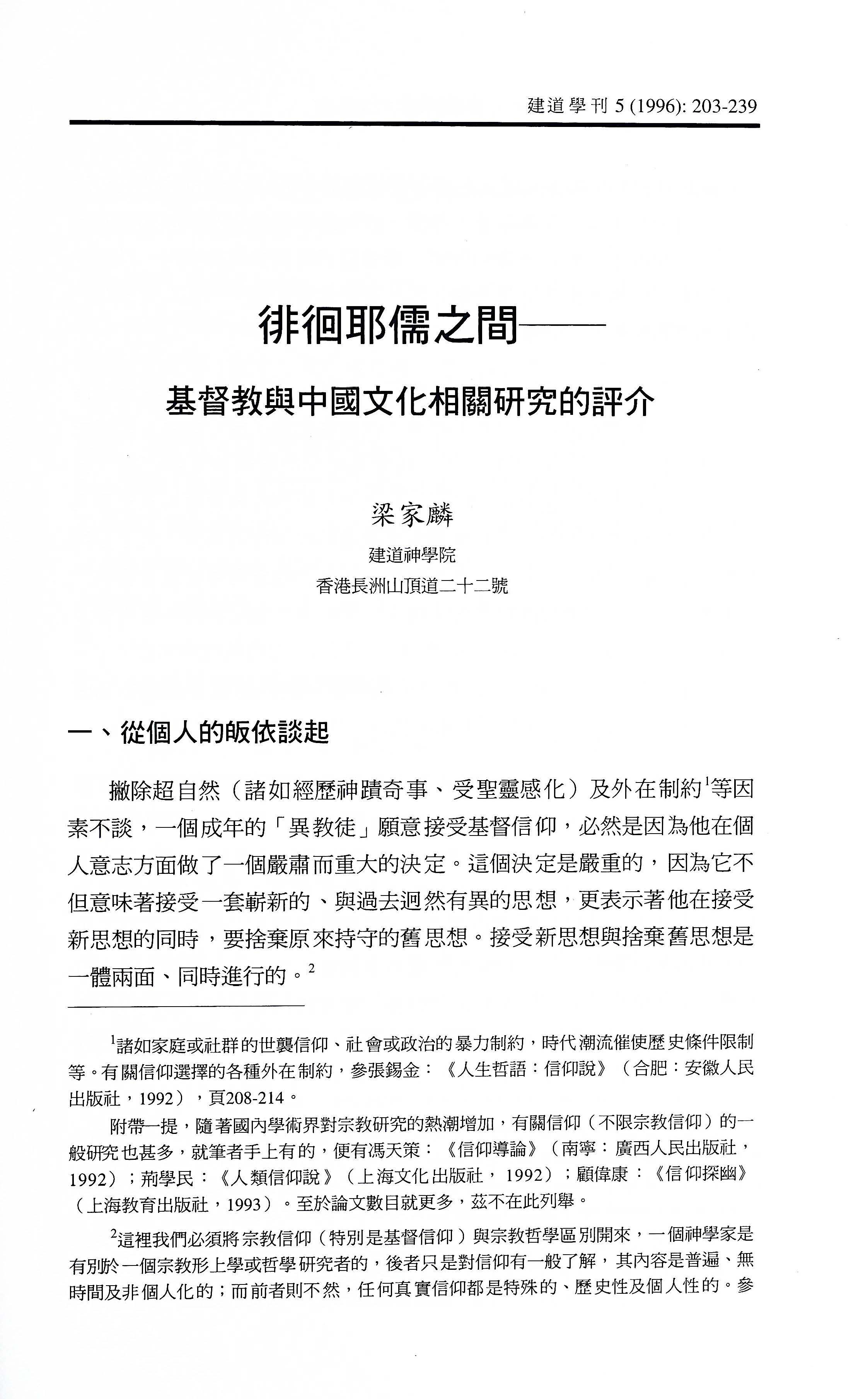 徘徊耶儒之間──基督教與中國文化相關研究的評介 / 梁家麟
