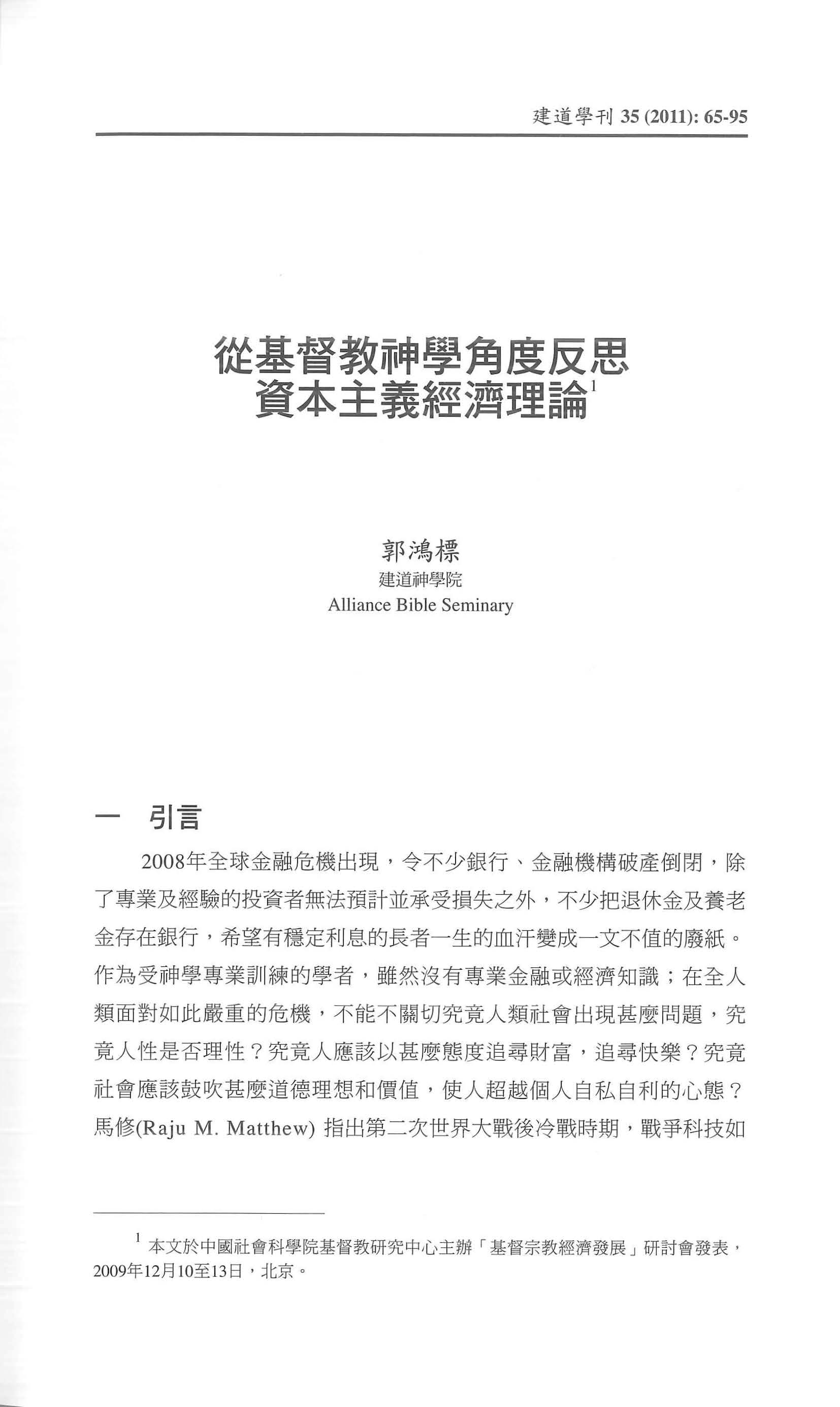 2008年金融海嘯後,除了反思金融機構監管問題外,更涉及對資本主義經濟理論本身的思考。本篇文章除了引言與結論外,主要分為四部分:第一部分對史密斯(Adam Smith)資本主義的評論,第二部分「天主教新保守主義」訴諸社會「共同的善」補充資本主義的不足,第三部分「基督教社會主義」訴諸「經濟公義」補充資本主義的不足,第四部分中國處境下的基督教神學反省。筆者認為天主教新保守主義對資本主義抱着過分樂觀的期望;由於學術界在經濟理論的討論方面偏重北美洲的資料,對於歐洲的經濟理論較為陌生。所以,筆者特別介紹德國基督教社會主義的經濟理論,幫助大家進行在中國處境下的基督教神學反省。
