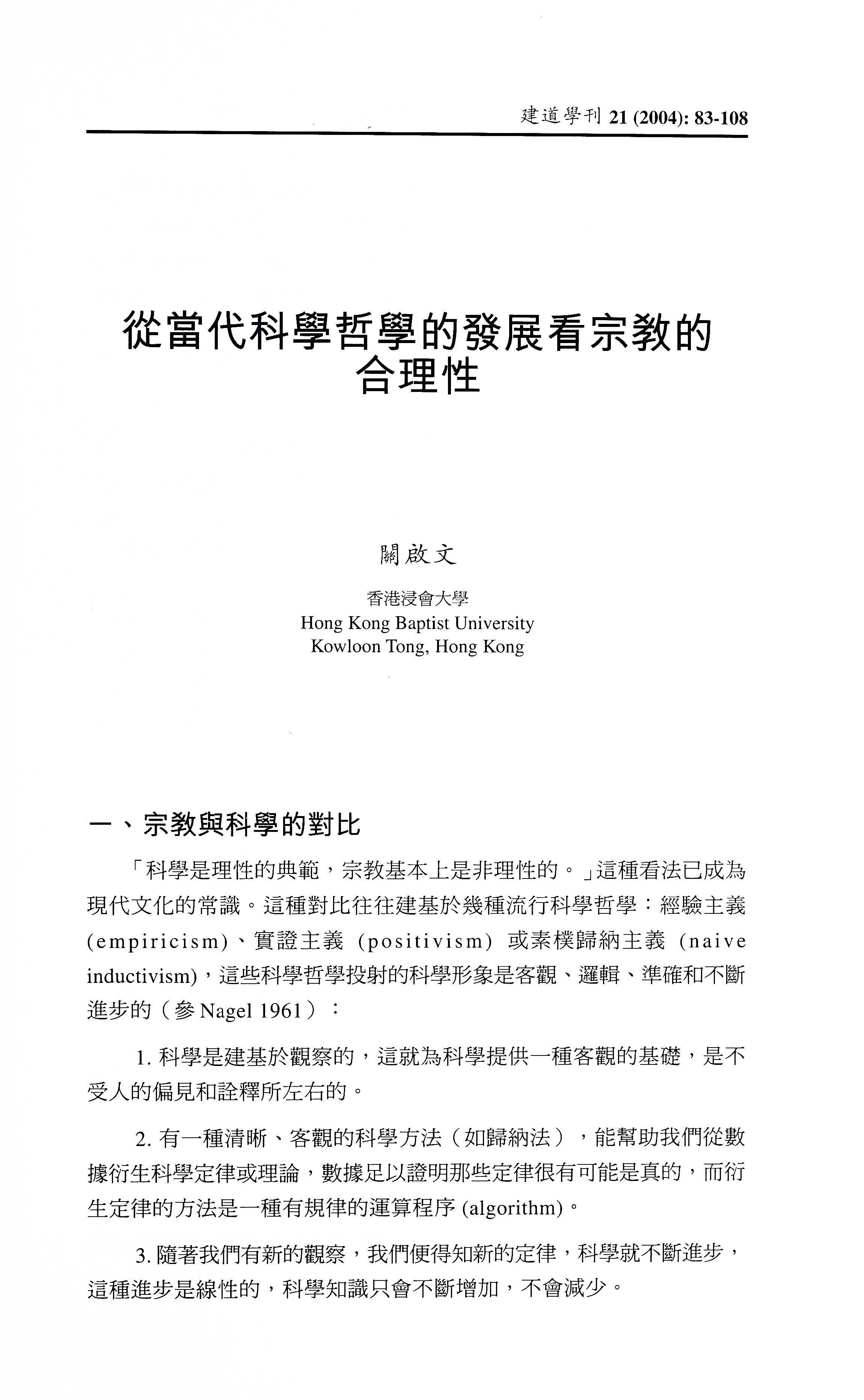 「科學是理性的典範,宗教基本上是非理性的。」這種看法好像不可置疑的常識,然而卻是建基於某些現代的科學哲學:實證主義(positivism)和素樸歸納主義(naive inductivism) ,這些科學哲學投射的科學形象是客觀、邏輯、準確和不斷進步的,對比起來,宗教自然顯得主觀。然而當代科學哲學的發展普遍質疑以上的科學觀,本文會透過兩位重要的當代科學哲學家(波普和孔恩)的思想,帶出實證論等的不足,從而論證傳統的科學與宗教的對比的錯謬。筆者亦會探討波普和孔恩如何啟迪我們再思宗教的合理性。