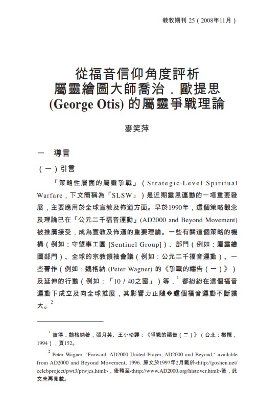 從福音信仰角度評析屬靈繪圖大師喬治.歐提思(George Otis) 的屬靈爭戰理論/麥笑萍