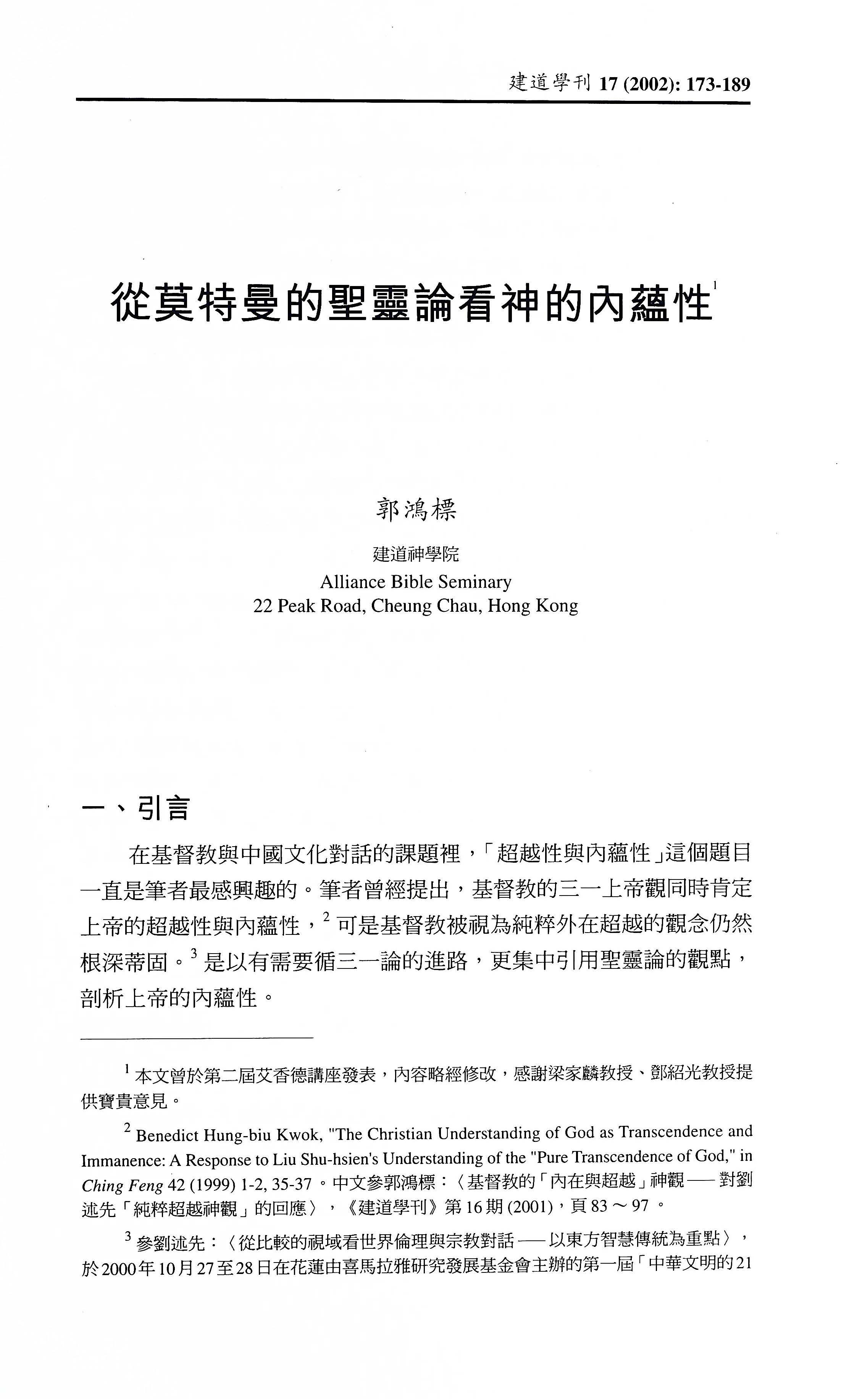 從莫特曼的聖靈論看神的內蘊性/郭鴻標