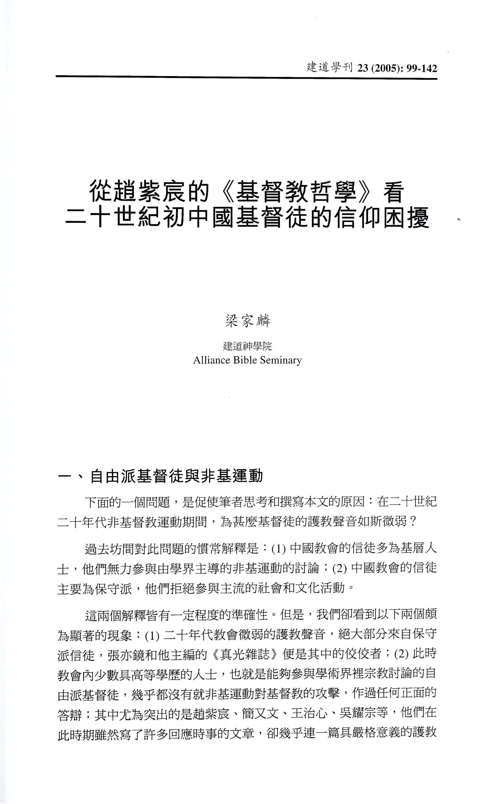 從趙紫宸的《基督教哲學》看二十世初中國基督徒的信仰困擾/梁家麟