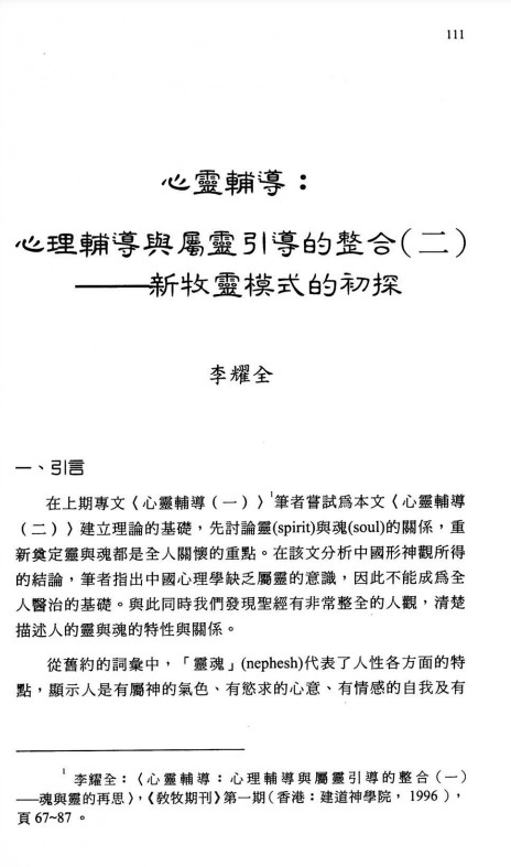 心靈輔導:心理輔導與屬靈引導的整合(二)——新牧靈模式的初探/李耀全