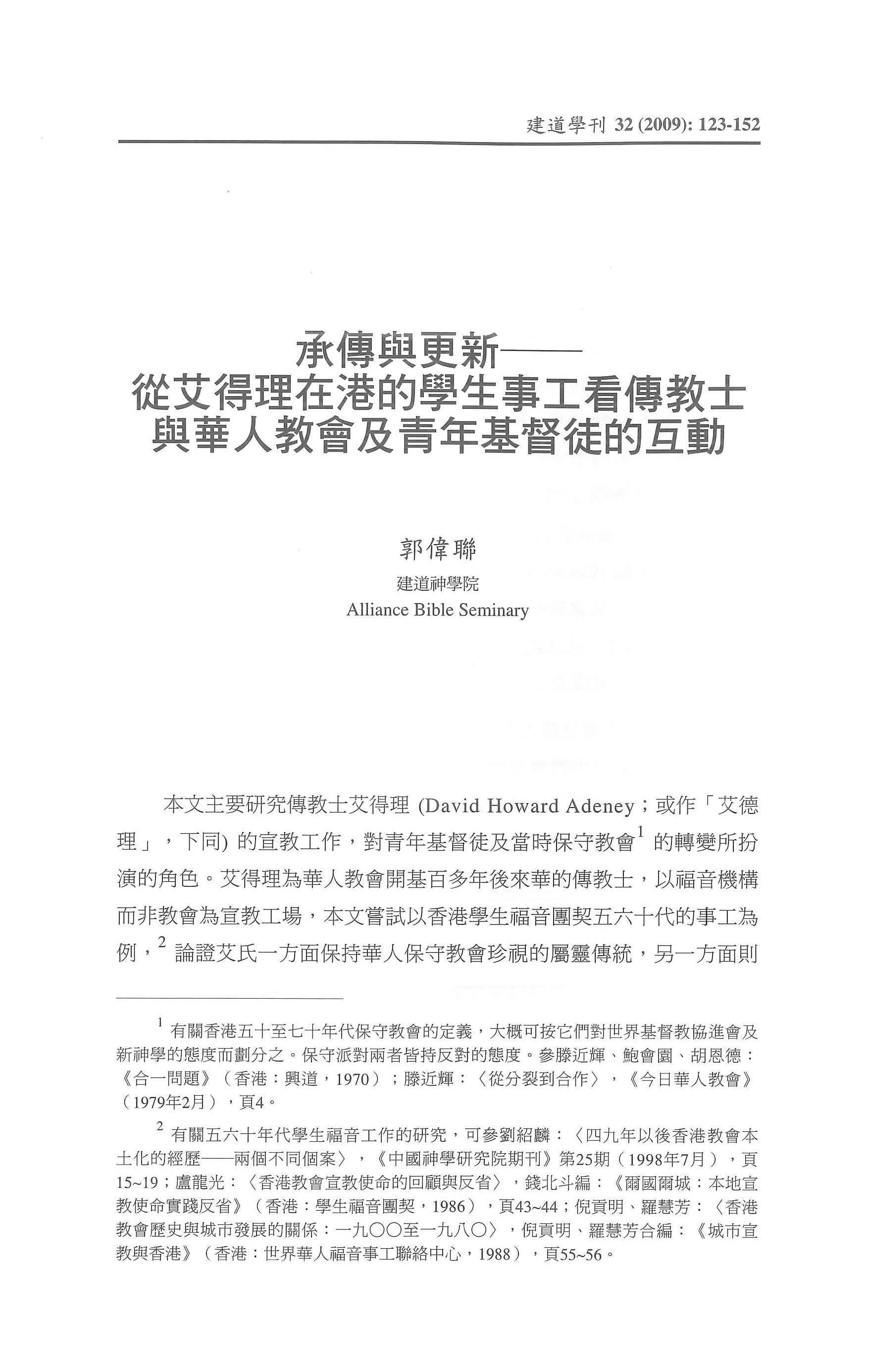 承傳與更新——從艾得理在港的學生事工看傳教士與華人教會及青年基督徒的互動/郭偉聯
