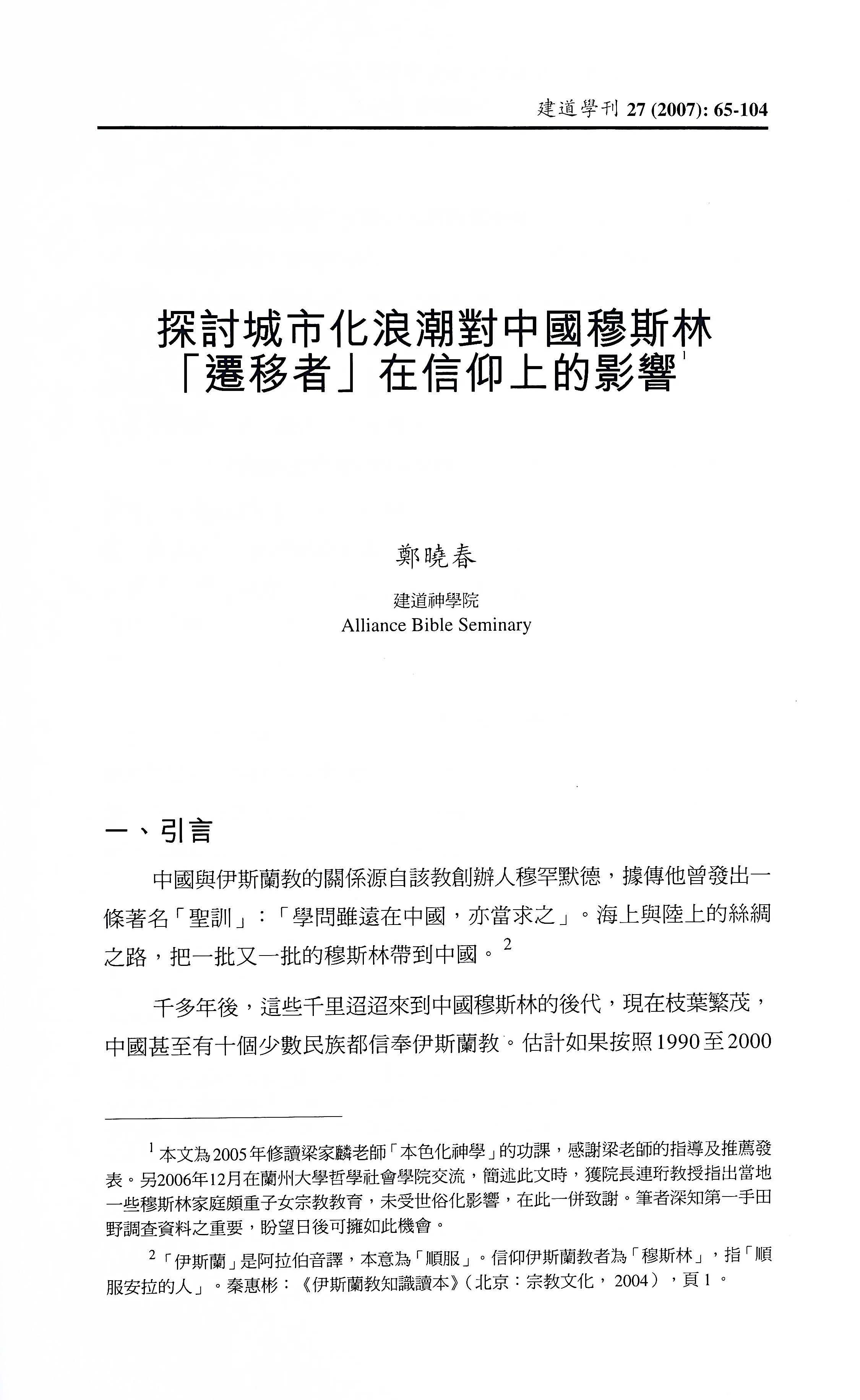 探討城市化浪潮對中國穆斯林「遷移者」在信仰上的影響 /鄭曉春