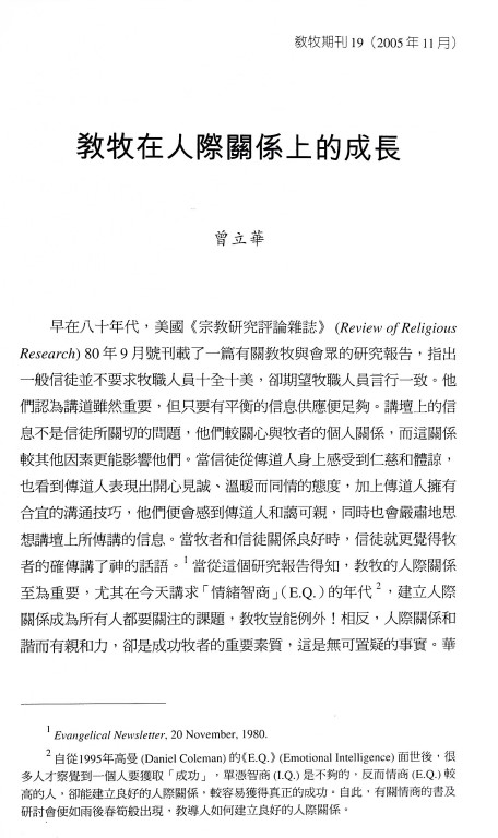 一篇有關教牧與會眾的研究報告指出,一般信徒關心與牧者的個人關係,而這關係較其他因素更能影響他們。當牧者和信徒關係良好時,信徒就更覺得牧者的確傳講了神的話語。人際關係是教會牧養及行政運作上不可忽視的重要環節。