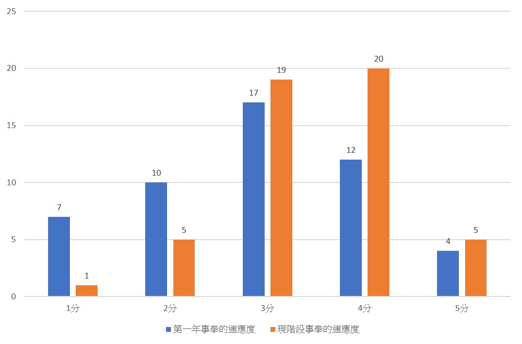 從受訪者的性別來看,男性和女性的比例各佔50%。圖二顯示了男性與女性在「第一年適應度」及「現階段適應度」上的平均分數差異。結果顯示,男性在適應度上的表現整體優於女性,第一年適應度男性平均分約為3.12,女性則約為2.72,顯示男性在初期適應方面更具優勢。然而,隨著牧會時間的增加,女性的適應度有顯著提升,現階段適應度男性平均分約為3.6,女性約為3.32,性別間的適應差距明顯縮小,說明女性適應能力在後期逐漸追上男性水平,呈現穩步提升的趨勢。