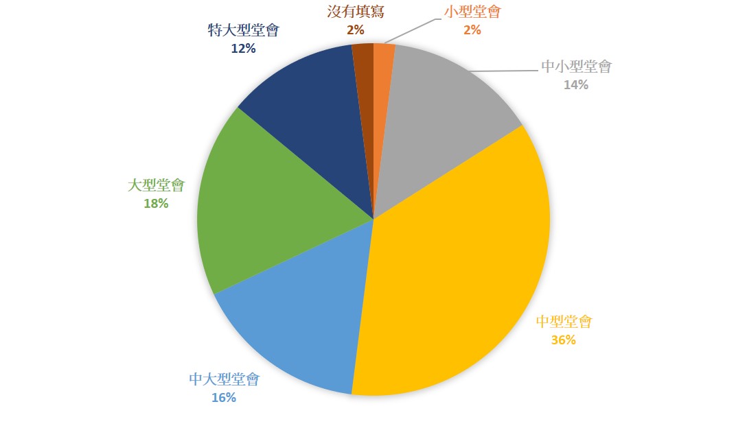 本部份按崇拜出席人數將堂會分成六個分屬,[7]分別是小型堂會(1-50人內)、中小型堂會(51-100人內)、中型堂會(101-200人內)、中大型堂會(201-500人內)、大型堂會(501-1000人內)、特大型堂會(1000人以上)。有關是次調查的50位受訪者,在中型堂會牧會的人數最多,佔36%。其次是大型堂會,有18%。然後依次序是中大型堂會,有16%;中小型堂會,有14%;特大型堂會,有12%;小型堂會有2%,其中有2%的受訪者沒有填寫。