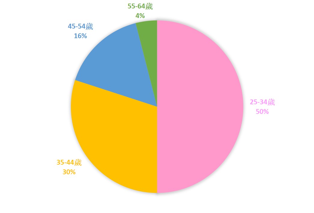 有關受訪者的年齡分佈,有50%屬於25-34歲,30%屬於35-44歲,16%屬於45-54歲,4%屬於55-64歲。