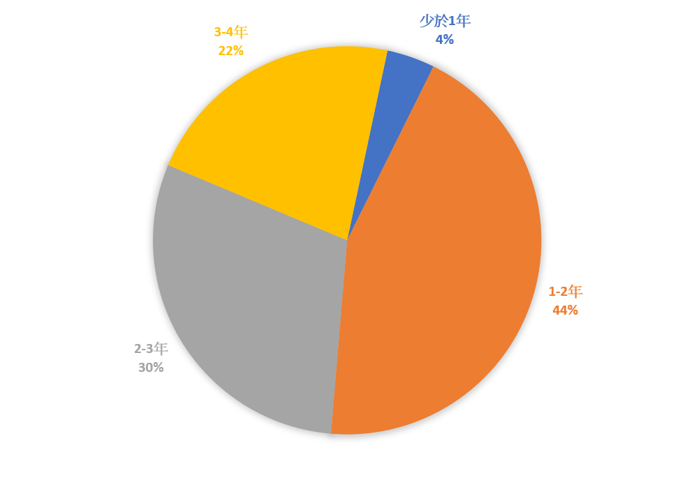 從是次調查的50位受訪者在教會牧會的年資來看,少於1年牧會經驗的佔4%,1-2年的牧會經驗佔44%,2-3年的牧會經驗佔30%,3-4年的牧會經驗佔22%。