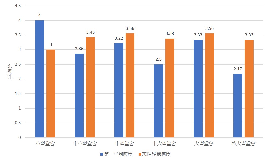 中小型堂會、中型堂會、中大型堂會、大型堂會和特大型堂會中牧者的現階段適應度均高於第一年適應度,反映隨著牧會時間增加,牧者整體的適應度都有提升。