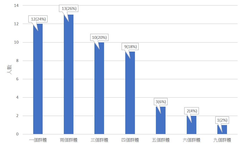 對於受訪每位牧者牧養不同群體的數量分佈如下:牧養兩個不同群體的比例佔最多,共有26%。其次是牧養一個群體的佔24%,然後依次序是牧養三個不同群體的有20%,牧養四個不同群體的有18%,牧養五個和六個不同群體的分別佔6%和4%,最後牧養九個不同群體的有2%。