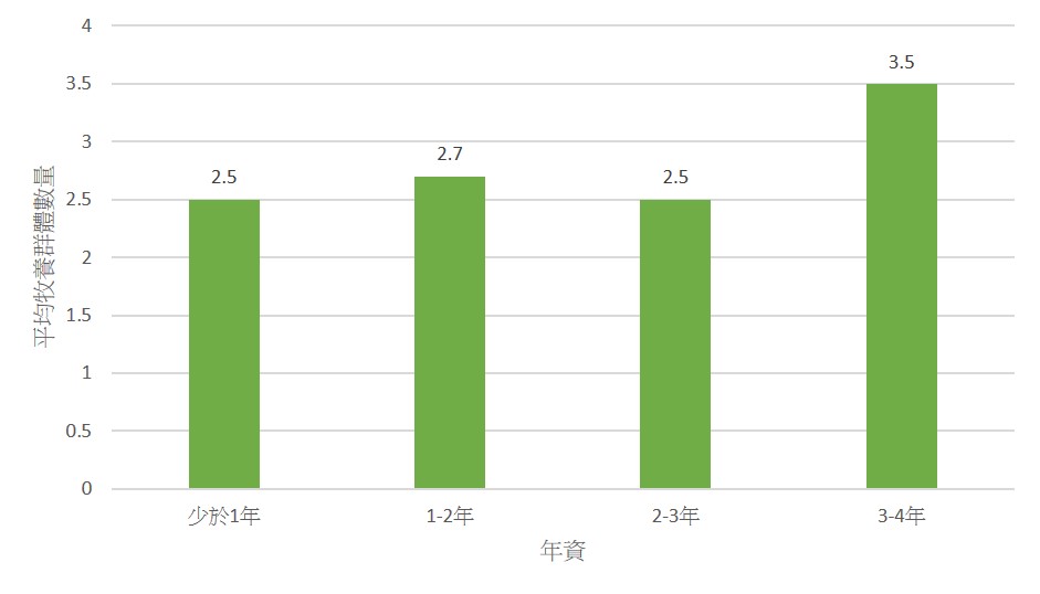 圖十二顯示牧會年資與牧養群體數量之間的關係,少於1年的牧者平均牧養2.5個不同年齡群體;牧會1-2年時,群體數量略增至2.7個,顯示能力逐步提升;但在牧會2-3年階段,群體數量回落至2.5個;到了牧會3-4年,群體數量顯著提升至3.5個,反映牧者經驗與能力成熟,隨著牧會越來越適應,牧養不同年齡群體的數量也有所增加。
