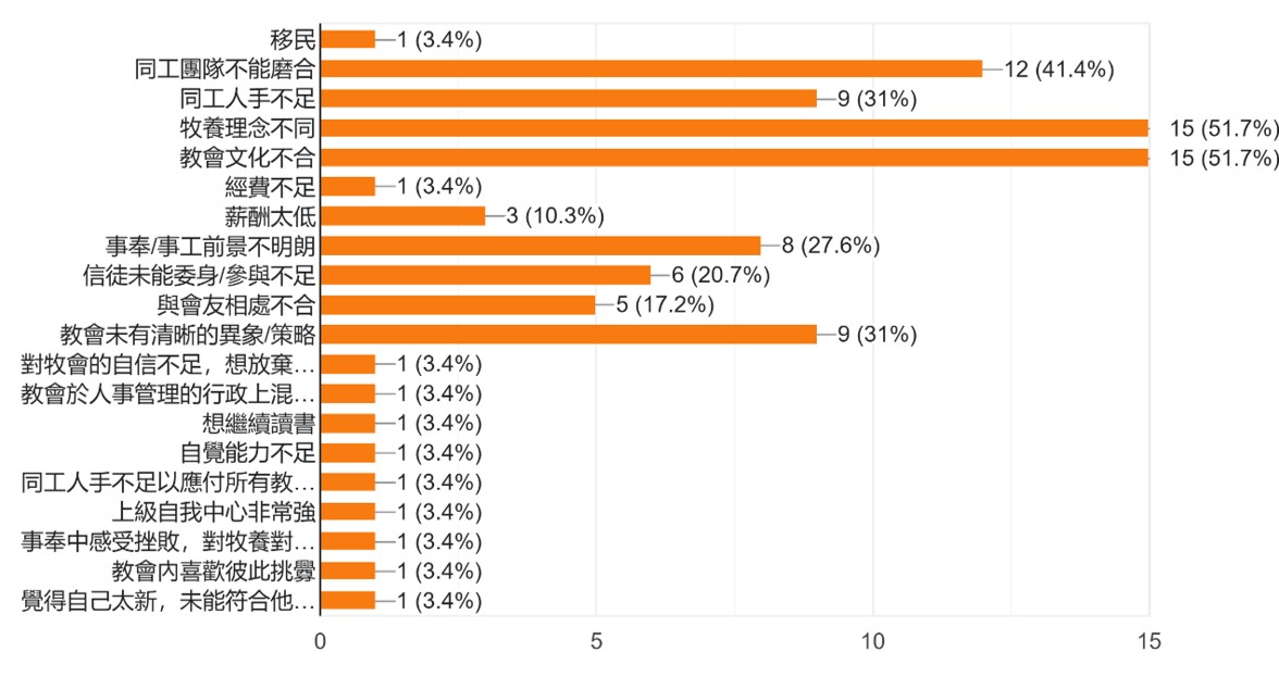 然而,有甚麼原因促使牧者想離職呢?其中離職的原因包括:牧養理念不同、教會文化不合、同工團隊不能磨合、人手不足、教會未有清晰的異象等等,根據資料顯示,超過一半(51.7%)考慮離職的牧者表示,「牧養理念不同」及「教會文化不合」是他們考慮離職的原因比例最高。其次是「同工團隊不能磨合」,有41.4%。然後依次序是「同工人手不足」及「教會未有清晰的異象/策略」,各有31%。「事奉/事工前景不明朗」有27.6%;「信徒未能委身/參與不足」有20.7%;「與會友相處不合」有17.2%,而「薪酬太低」、「移民」、「經費不足」等原因所佔的比例則比較低。
