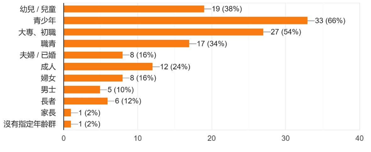 另外,青少年是牧養工作的主要集中群體,與25-34歲受訪者的比例相符。年輕牧者能更容易與青少年建立互動,理解其需求,增加牧會適應的情況。大專、初職群體需求次高,與25-34歲及部分35-44歲受訪者的能力契合。新手牧者年齡接近此群體,亦有助增加牧會適應的情況。